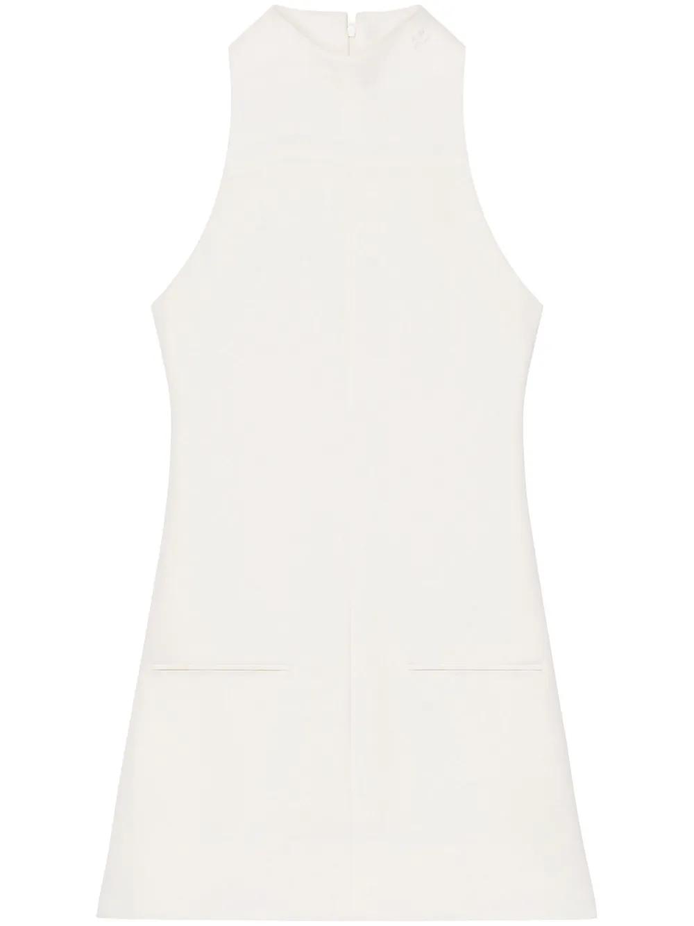 white twill weave logo patch to the front mock neck sleeveless two front welt pockets rear zip fastening A-line straight hem thigh-length