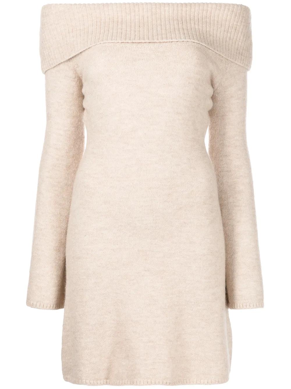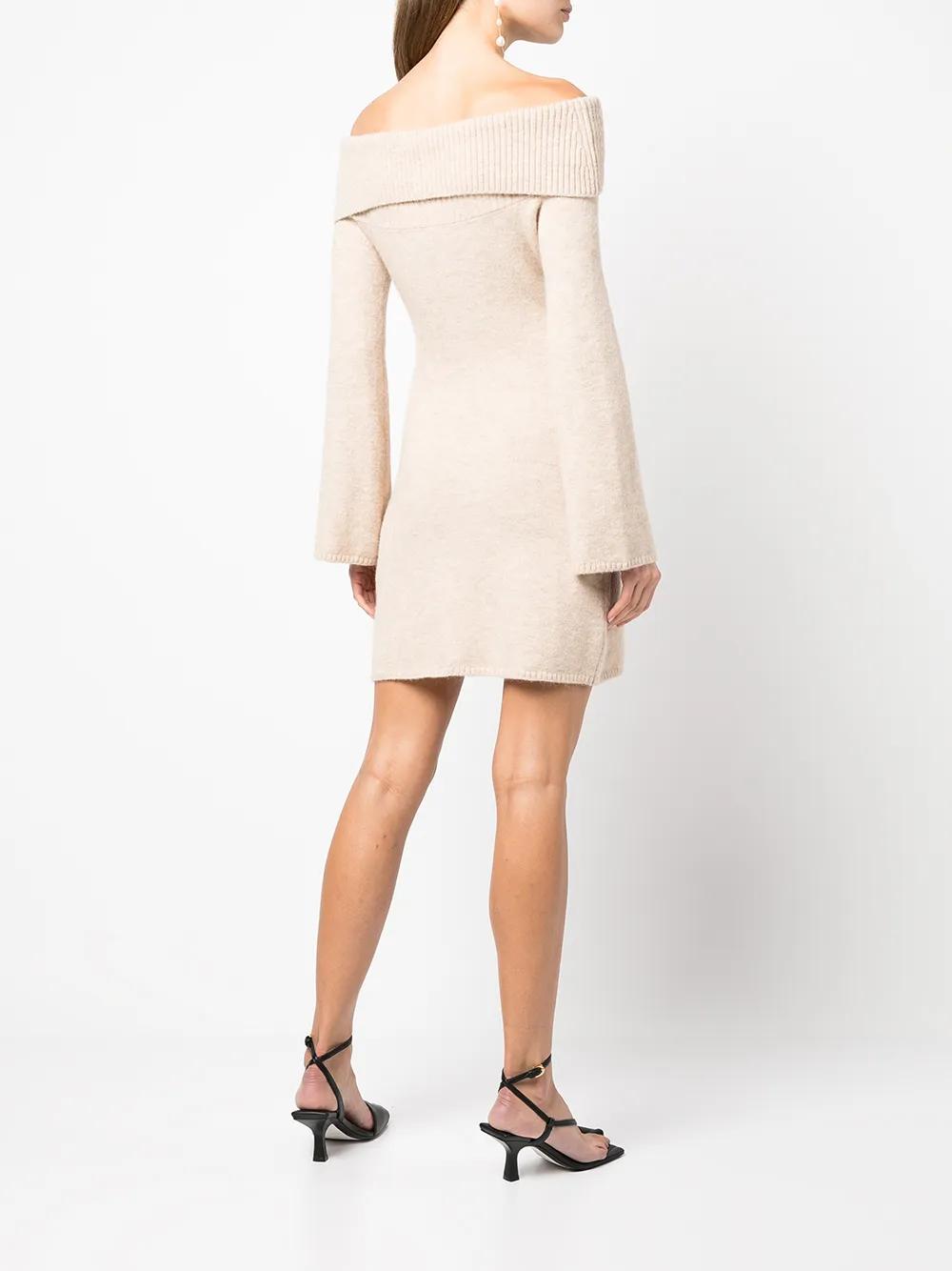 oatmeal wool blend ribbed detailing off-shoulder long sleeves thigh-length