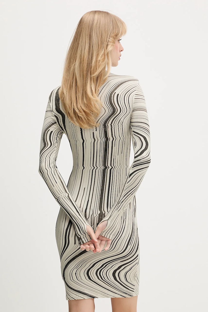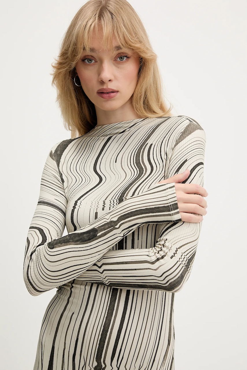 - Dopasowany, podkreślający sylwetkę fason. - Klasyczny, okrągły dekolt. - Model bez podszewki. - Prążkowana struktura materiału sprawia, że jest on niezwykle elastyczny i doskonale przylega do ciała. - Długość rękawa: 64 cm. - Długość: 94 cm. - Szerokość pod pachami: 38 cm. - Szerokość w talii: 30 cm. - Szerokość w biodrach: 40 cm. - Wymiary podane dla rozmiaru: S.