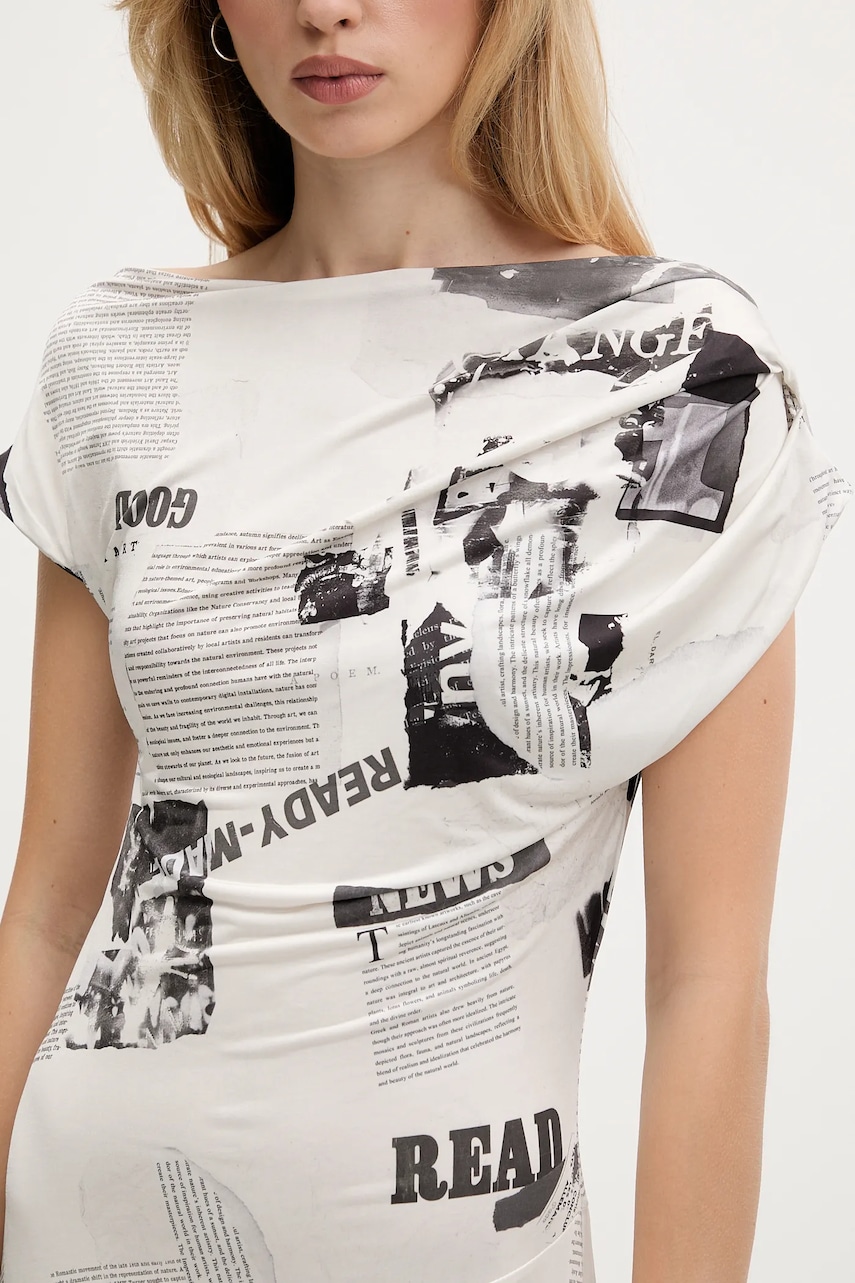 - Rozkloszowany fason. - Krótki rękaw. - Efektowny dekolt typu woda. - Model z podszewką z siateczki. - Sweter z okrągłym dekoltem i obniżoną linią ramion. - Długość rękawa(mierzona od dekoltu): 78 cm. - Długość: 50/97 cm. - Szerokość pod pachami: 61/41 cm. - Wymiary podane dla rozmiaru: S.