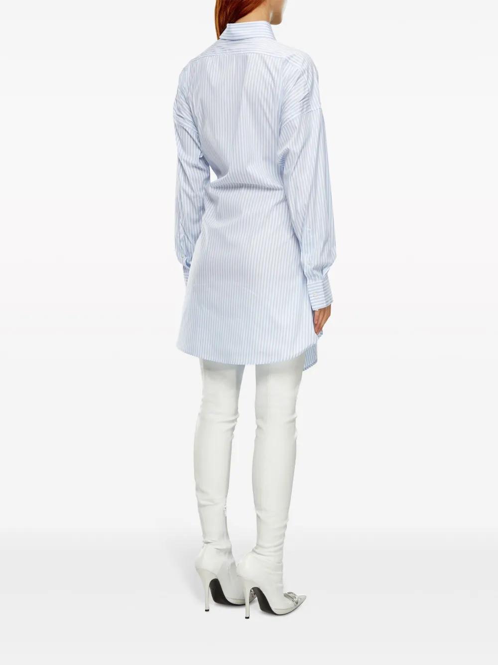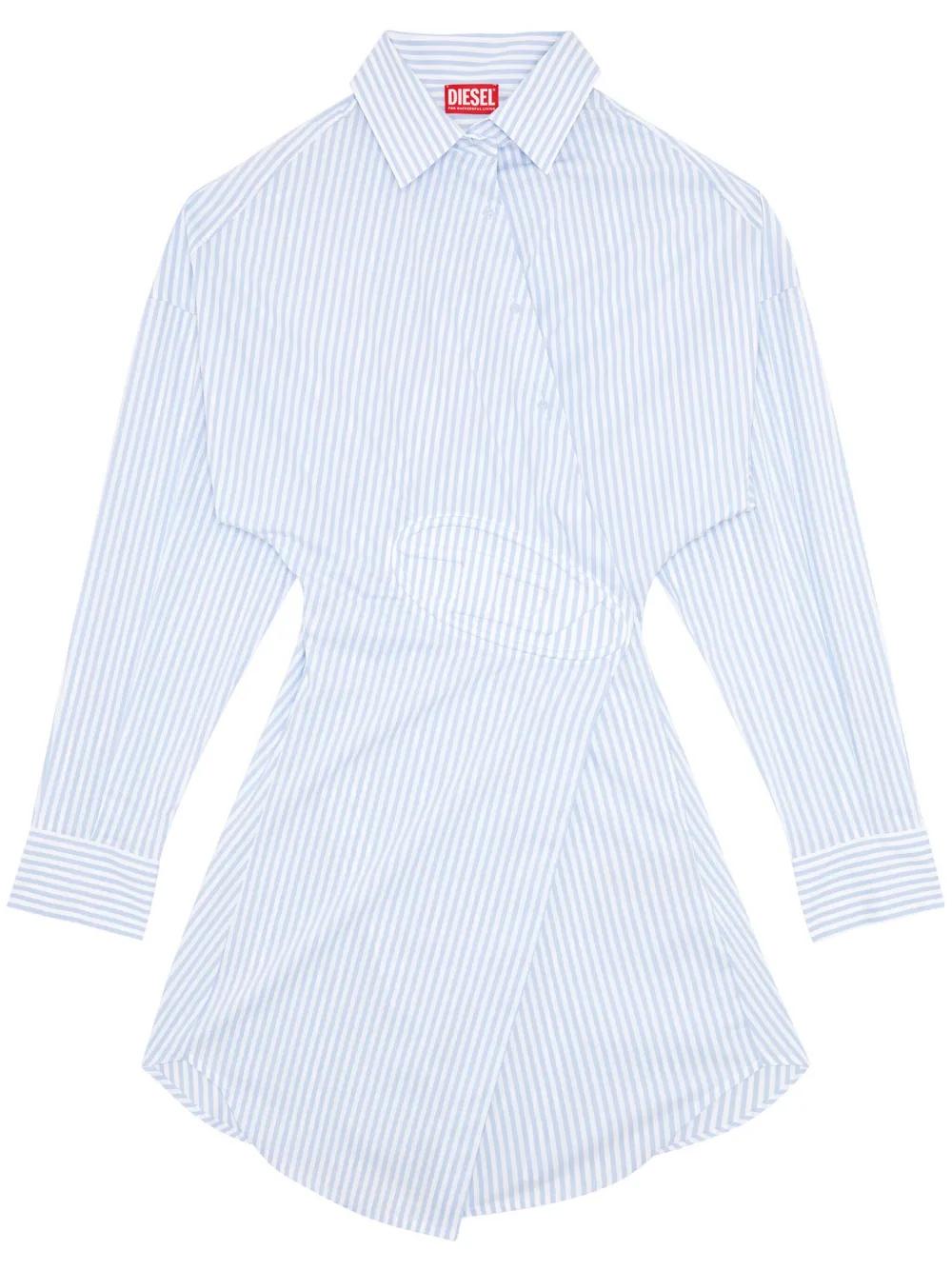 light blue/white cotton blend poplin texture wrap design vertical stripe pattern spread collar long sleeves buttoned cuffs Oval D logo plaque asymmetric hem front button and touch-strap fastening