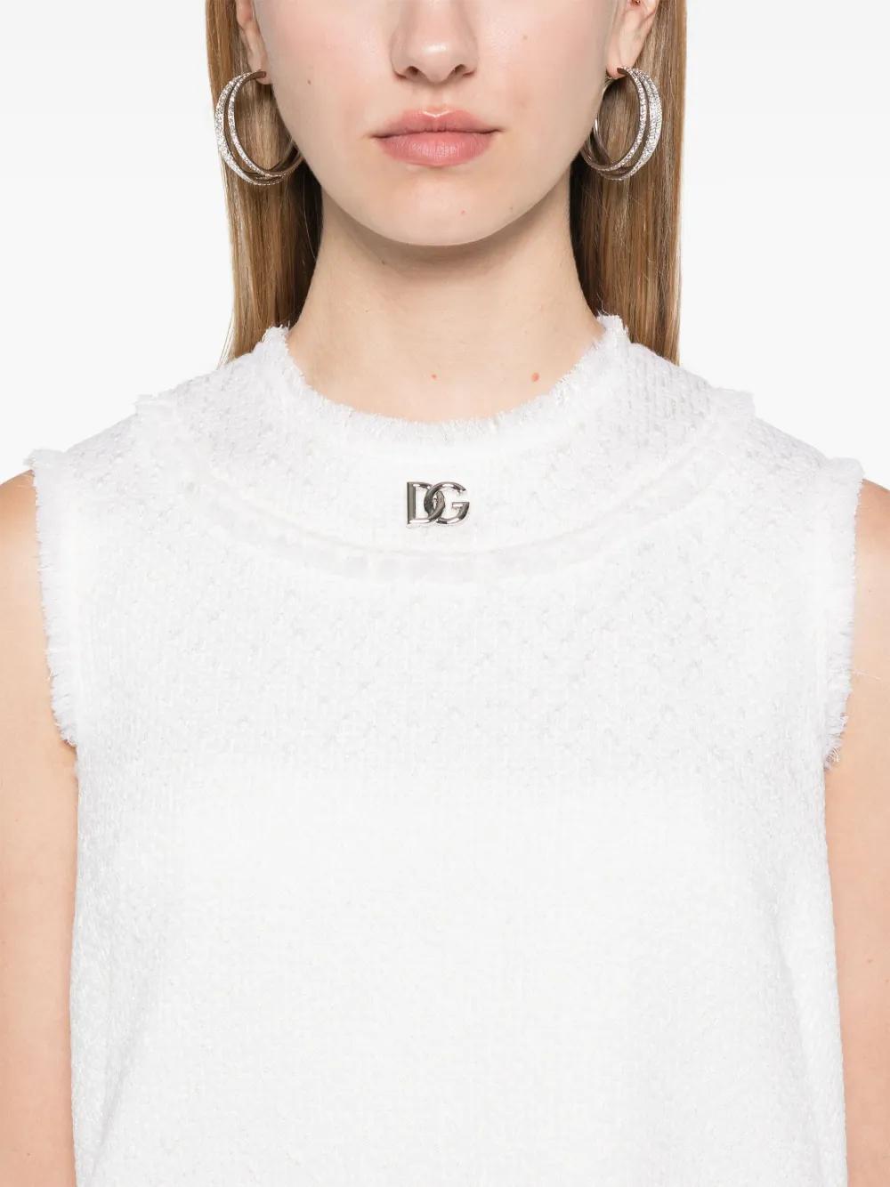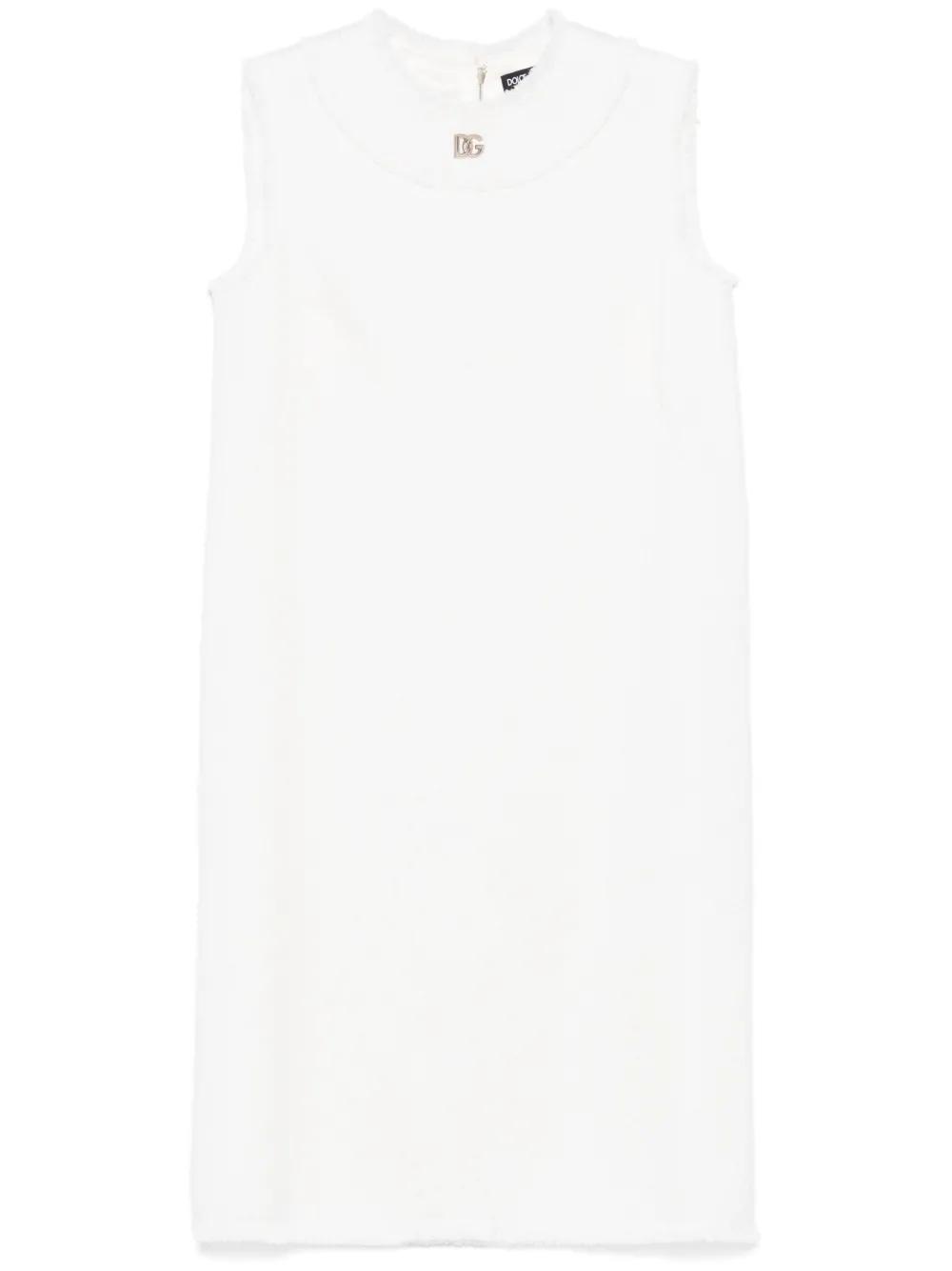 white virgin wool blend tweed silver-tone logo plaque concealed rear zip fastening shift style round neck fringe detailing sleeveless full lining straight hem thigh-length