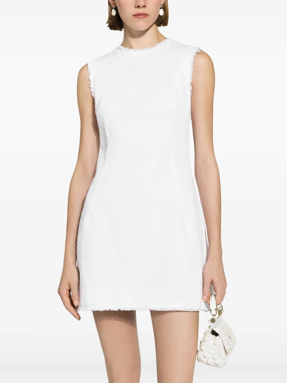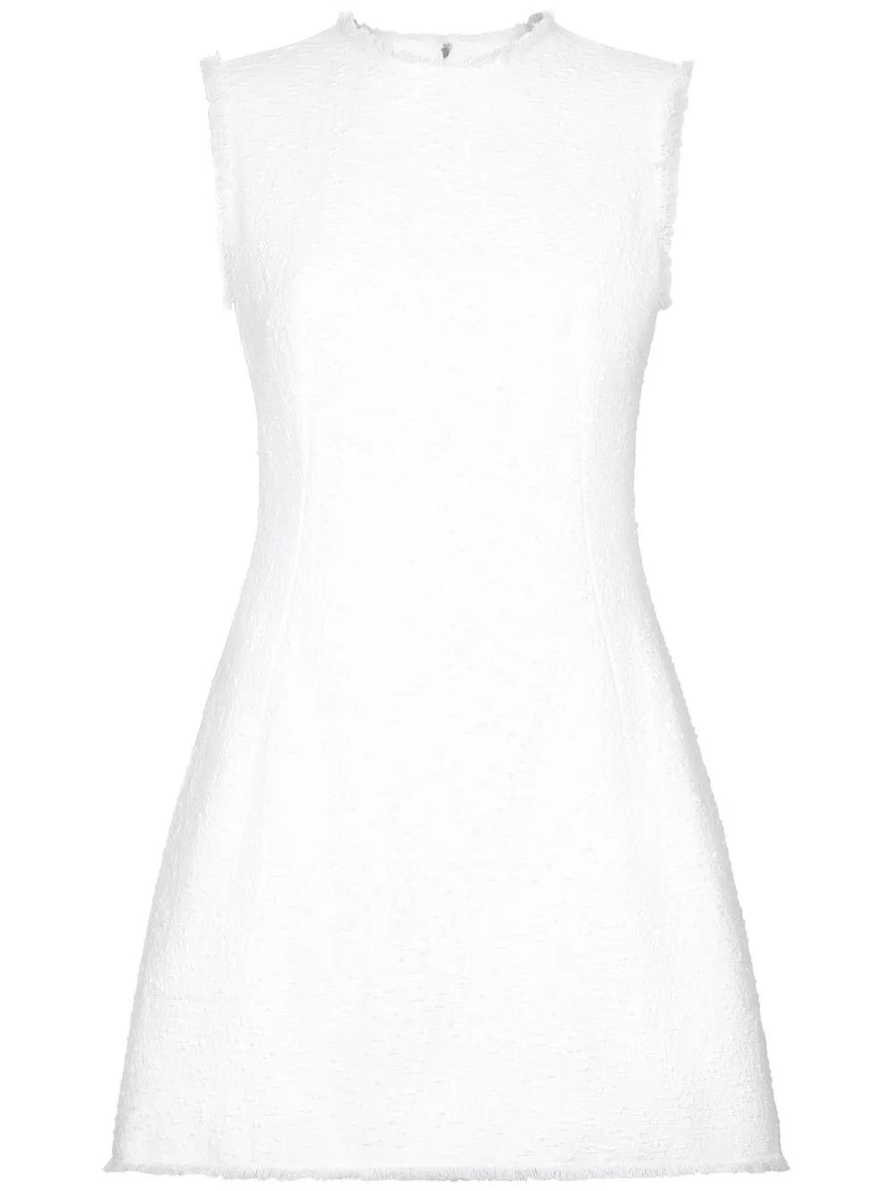 white cotton blend tweed round neck sleeveless rear zip fastening thigh-length straight hem