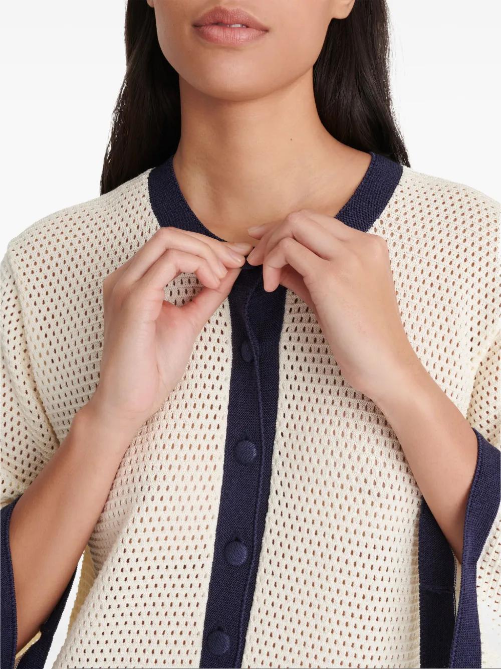 white short front button fastening round neck contrasting trim three-quarter length sleeves