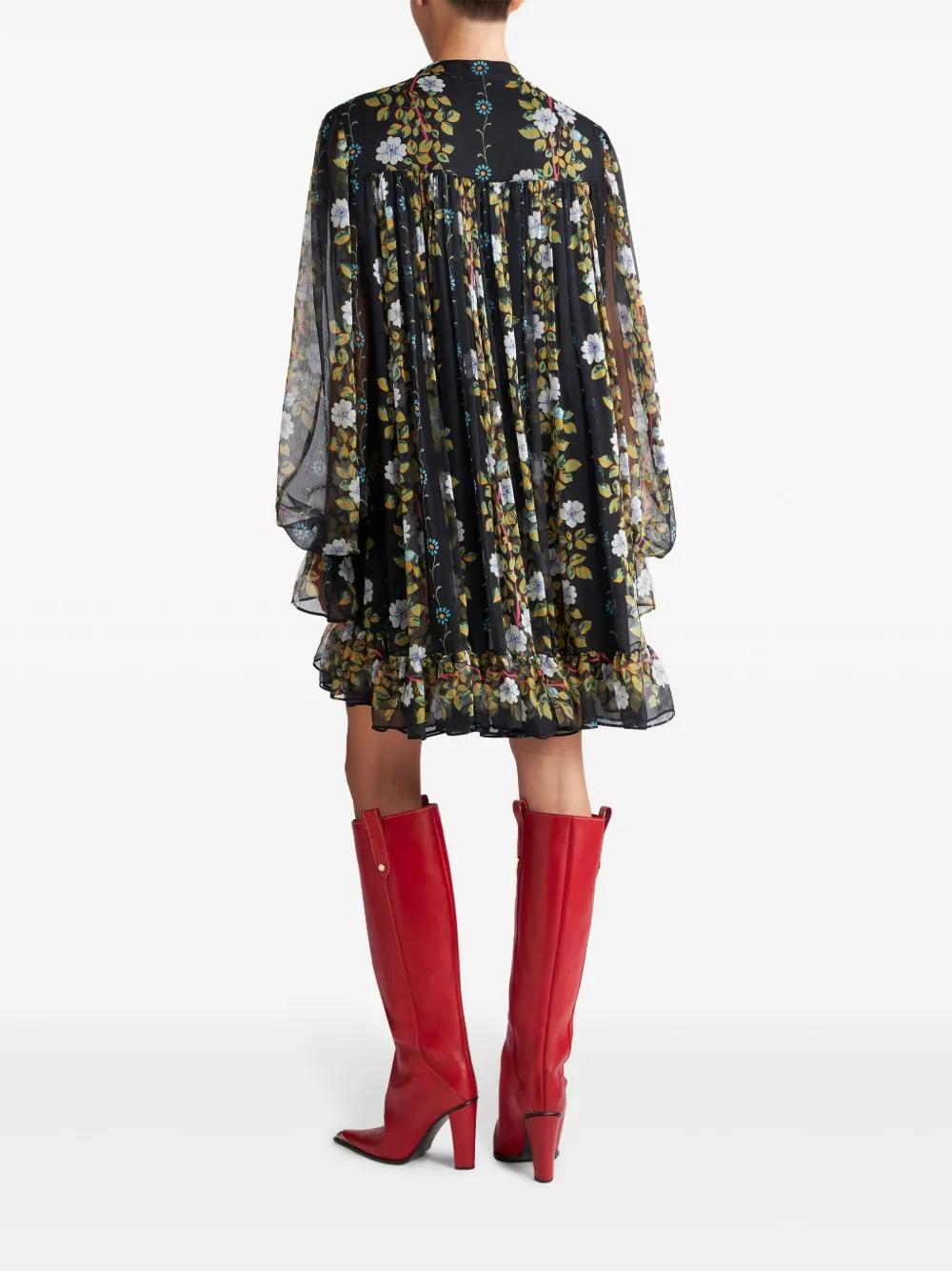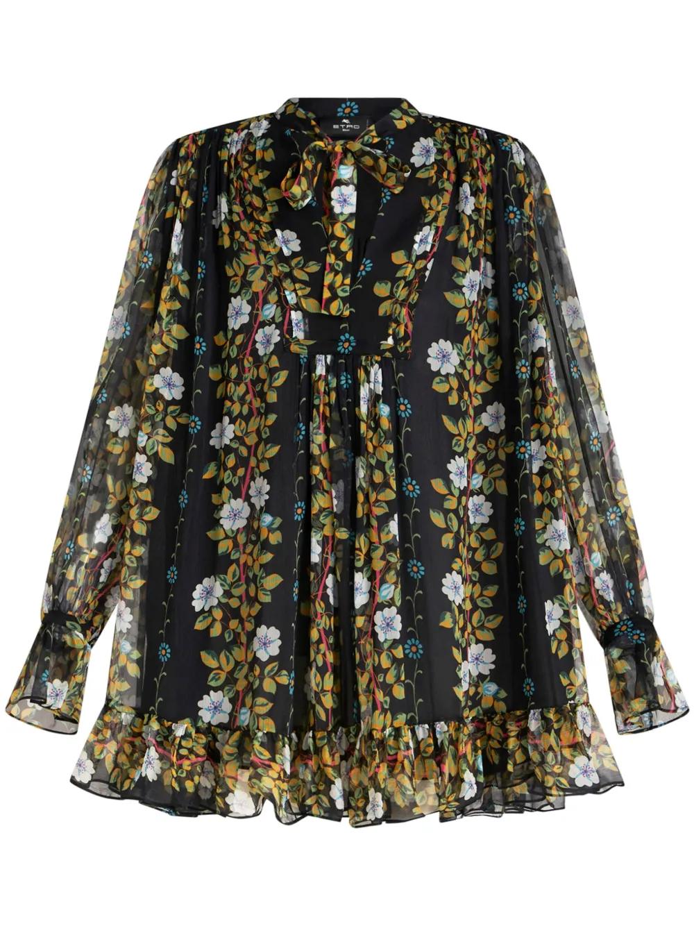 black silk floral print pussy-bow collar fully pleated long sleeves ruffle hem