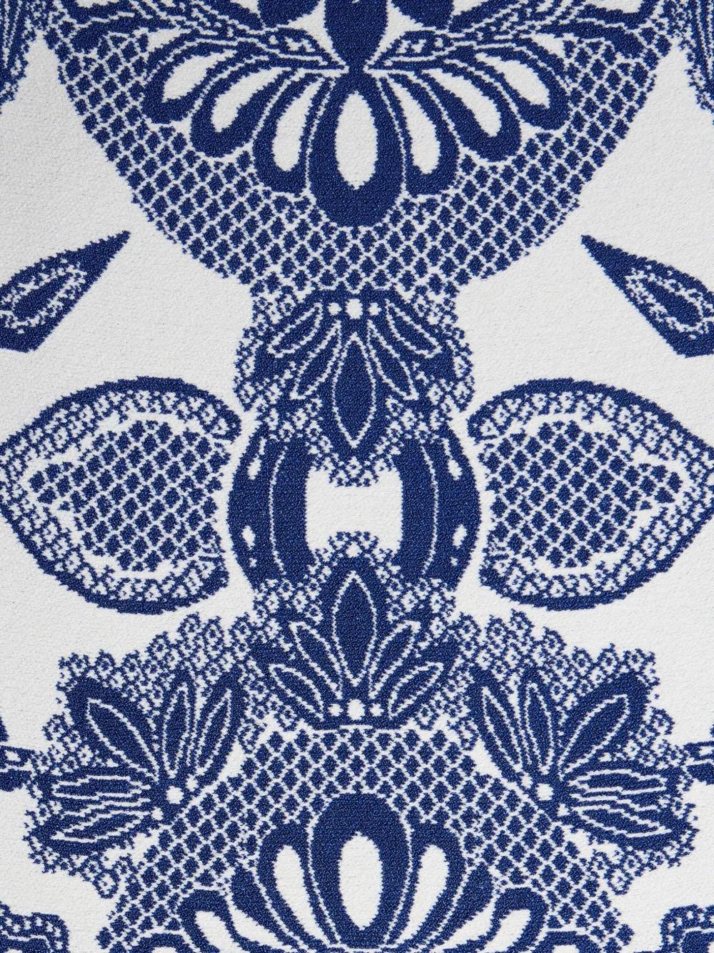 navy blue/light blue/yellow charmeuse abstract pattern print V-neck sleeveless decorative button detailing sleeveless ruched detailing ruffled detailing flared skirt unlined concealed side hook and zip fastening
