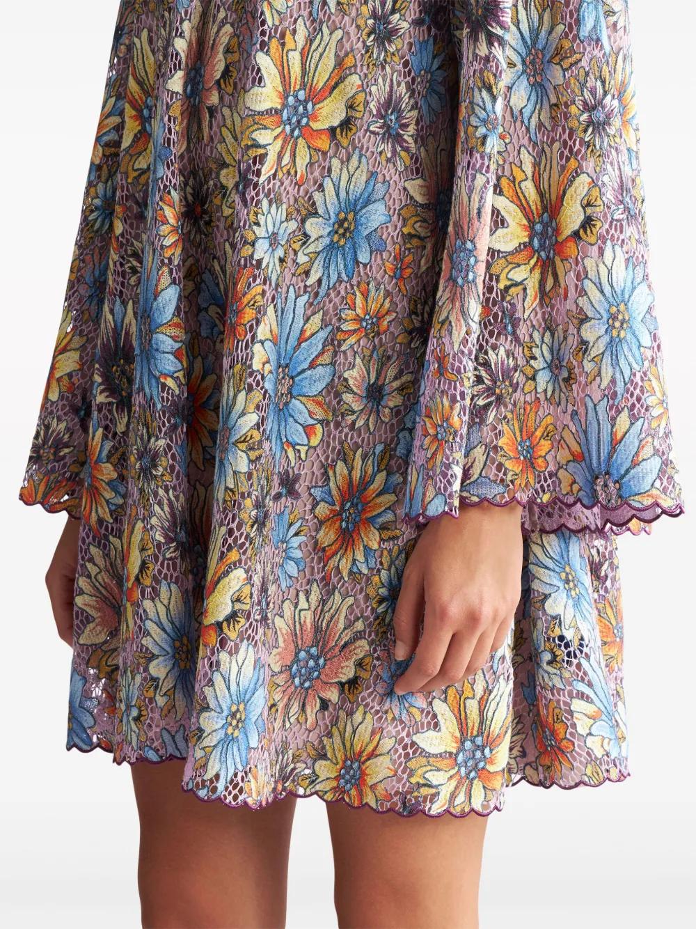 lilac/multicolour all-over floral print floral-lace detailing round neck long wide sleeves above-knee length rear button fastening keyhole detail to the rear scallop hem