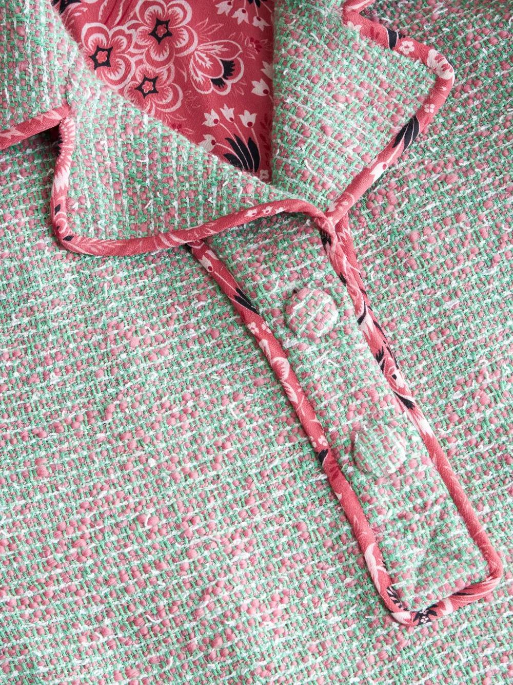 mint green/coral pink wool blend tweed piped-trim detailing notched collar short front button fastening short sleeves two side slit pockets frayed hem paisley-print lining