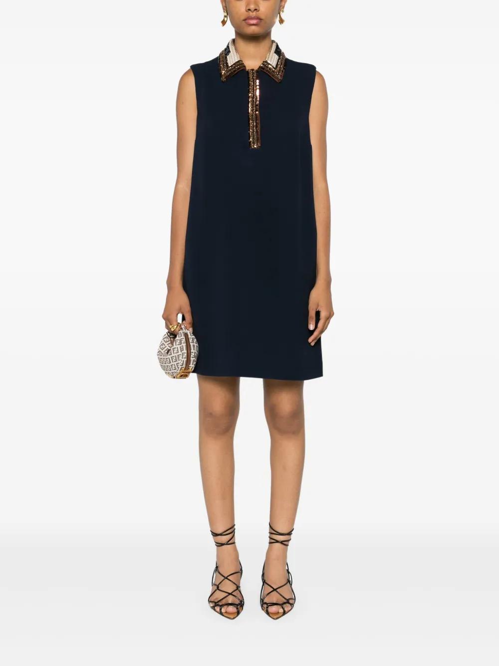 navy blue/brown/light beige wool-silk blend cady texture sequin-embellished trim polo collar front button placket sleeveless concealed side hook and zip fastening two side slit pockets full lining straight hem thigh-length