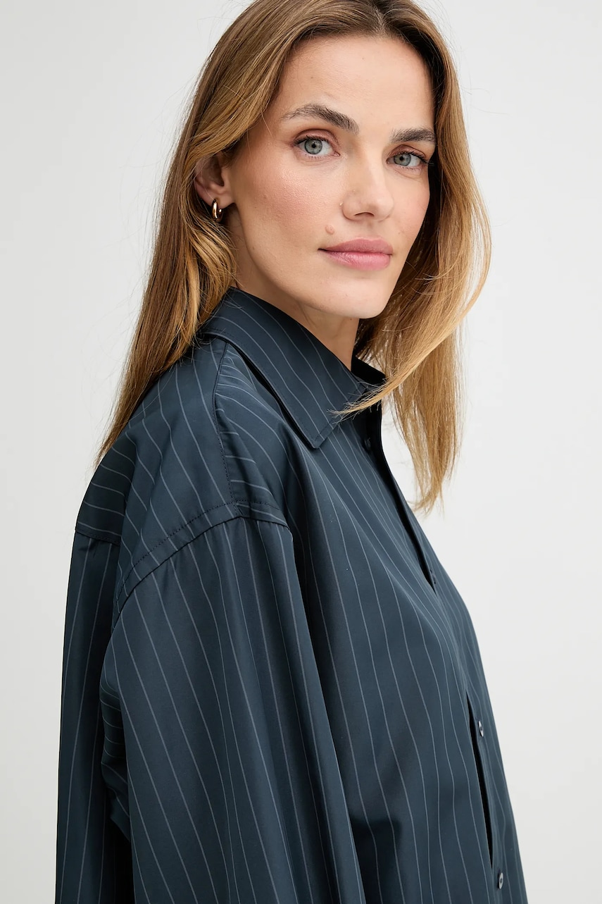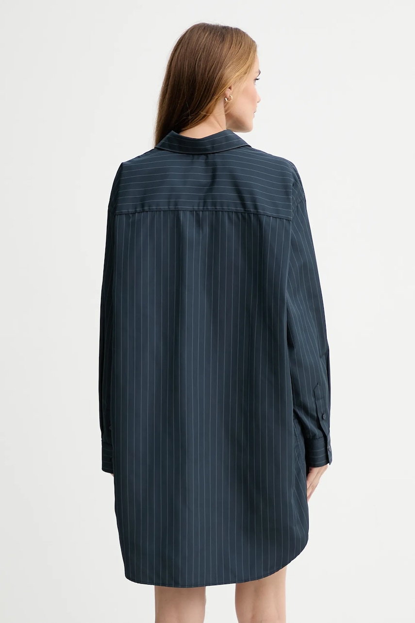 - Ten produkt został uszyty z poliestru pochodzącego z recyklingu. - Luźny fason. - Model o długości mini. - Długie rękawy. - Zapięcie na guziki. - Model z kołnierzykiem. - Mankiety zapinane na guziki. - Wzór w pasy. - Długość: 90 cm. - Długość rękawa: 56 cm. - Szerokość pod pachami: 62 cm. - Wymiary podane dla rozmiaru: S.