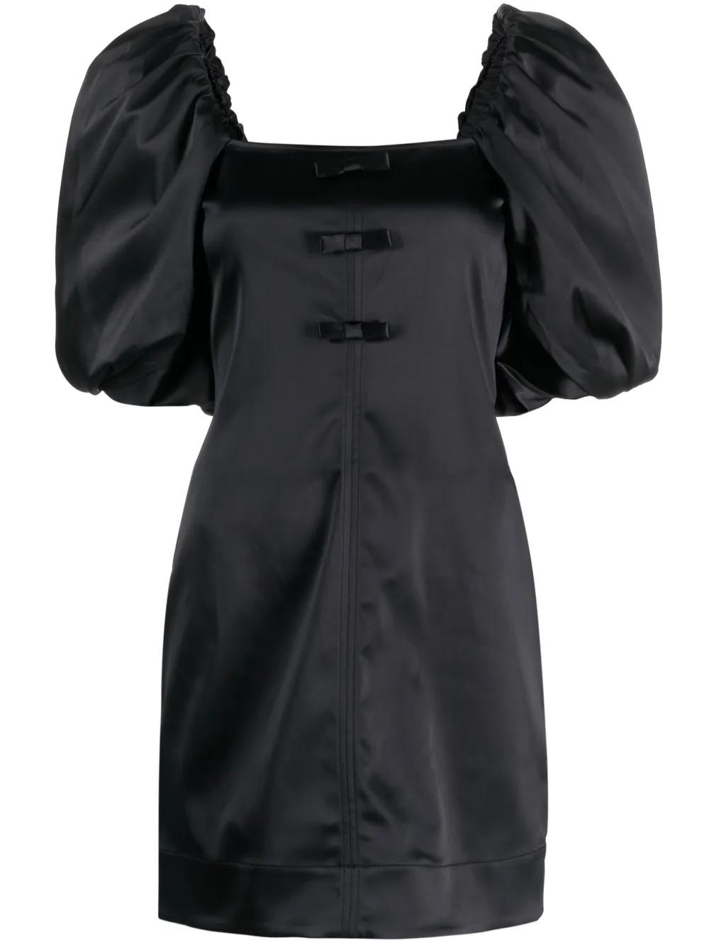black recycled polyester blend satin finish bow detailing square neck balloon sleeves fitted waistline concealed rear zip fastening straight hem thigh-length