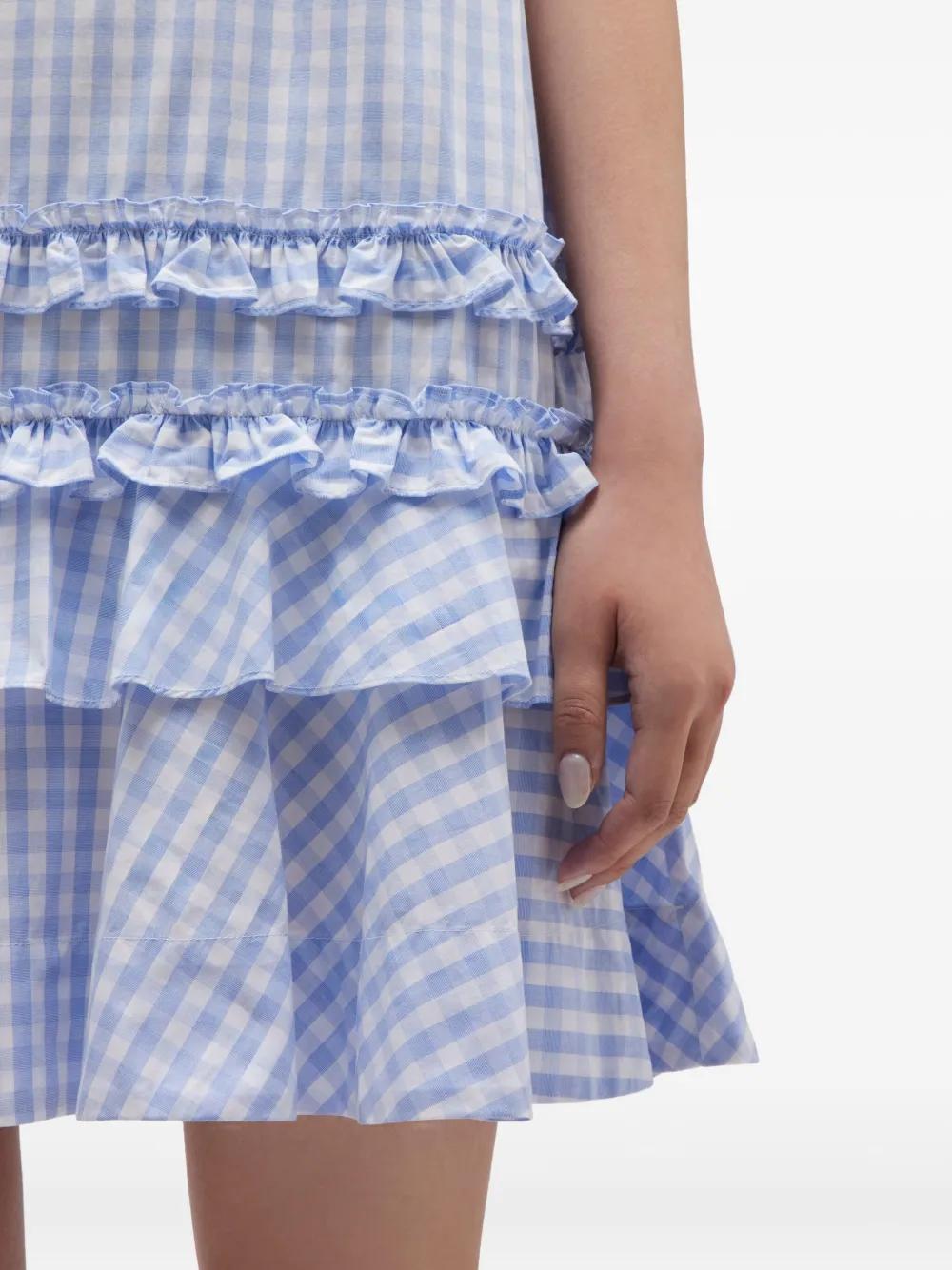 blue gingham pattern collared neckline short sleeves tiered ruffle hem