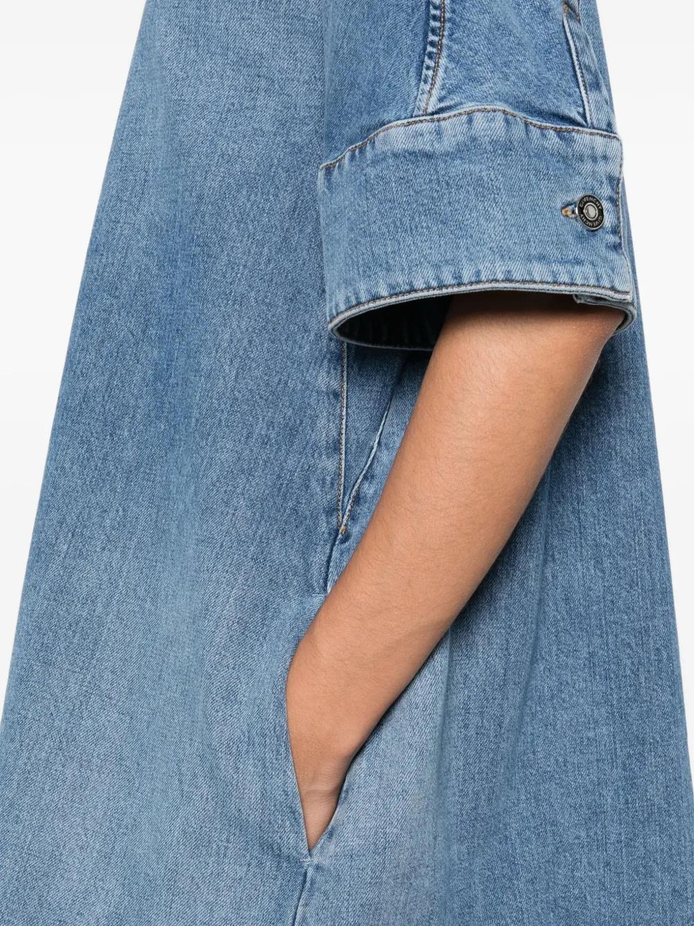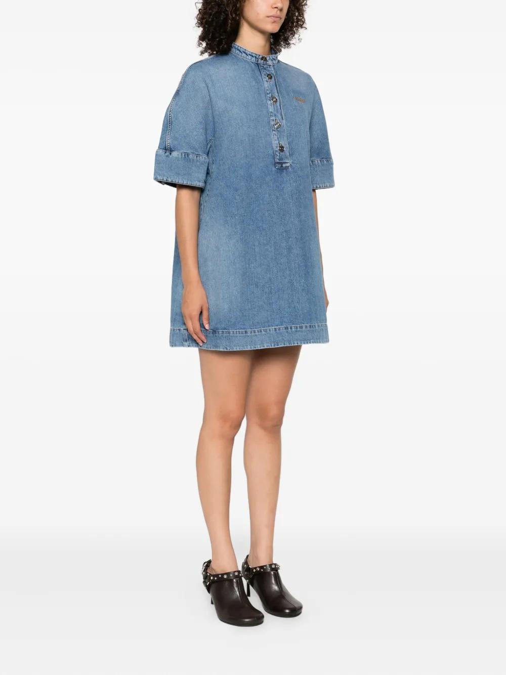 medium blue cotton short sleeves mock neck A-line embroidered logo