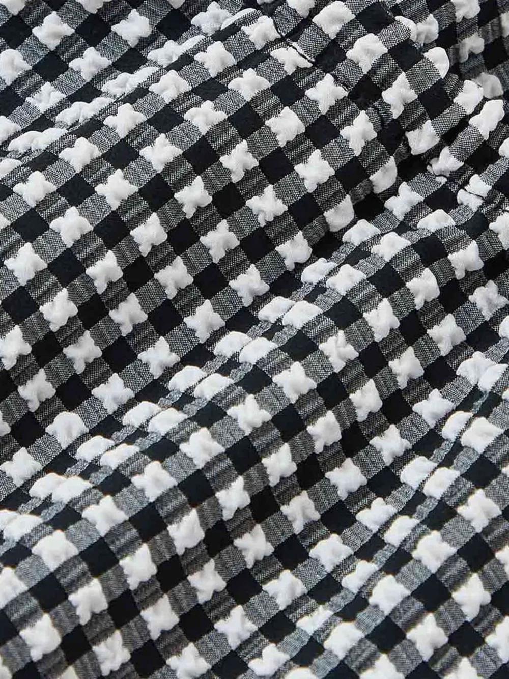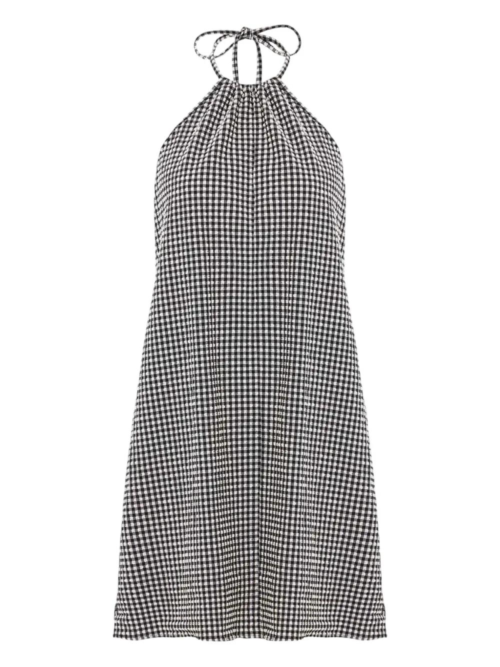 black and white gingham check pattern halterneck tie fastening seersucker texture a-line
