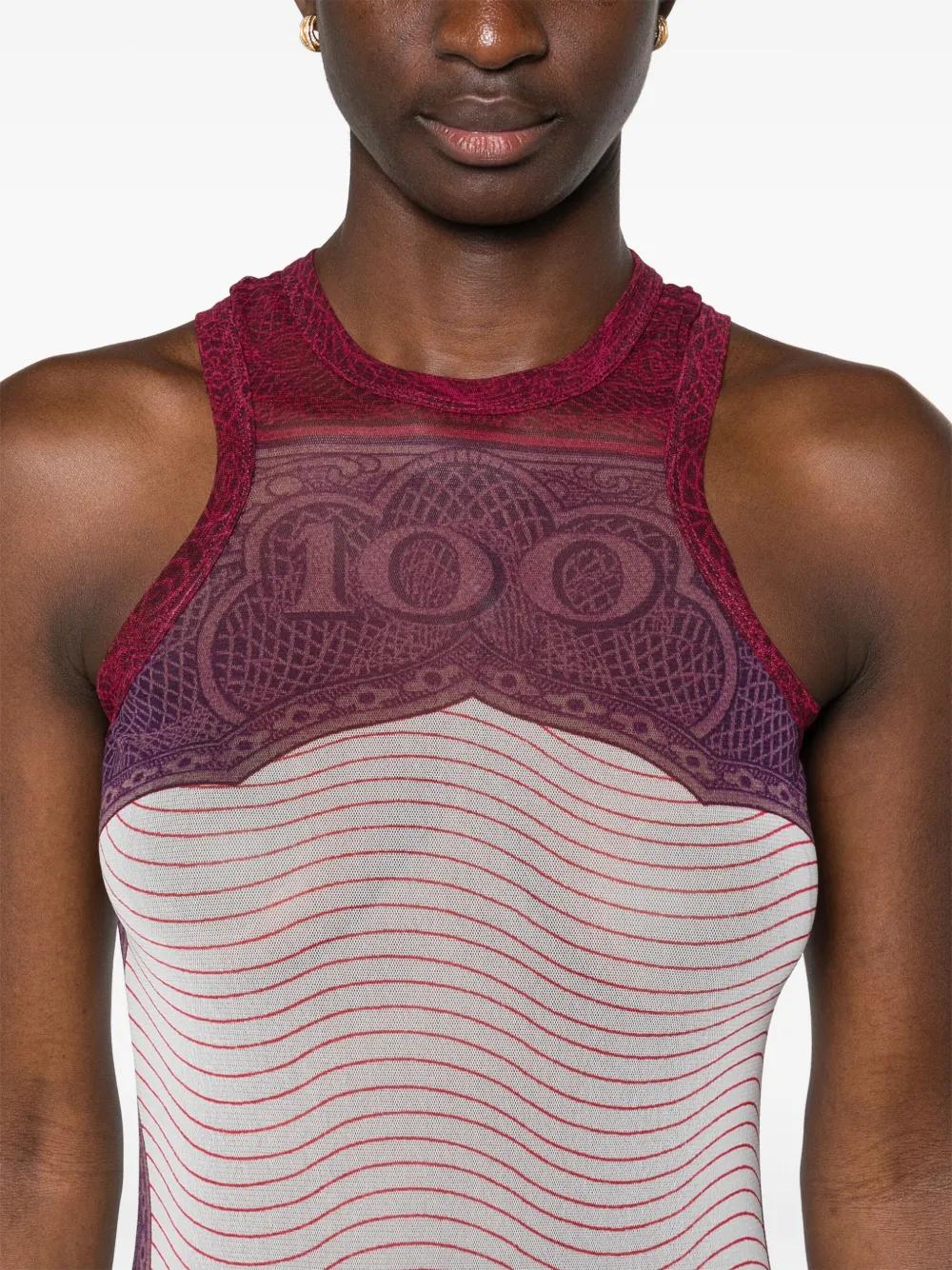 burgundy/multicolour tulle netting semi-sheer construction all-over graphic print round neck racerback sleeveless straight hem thigh-length