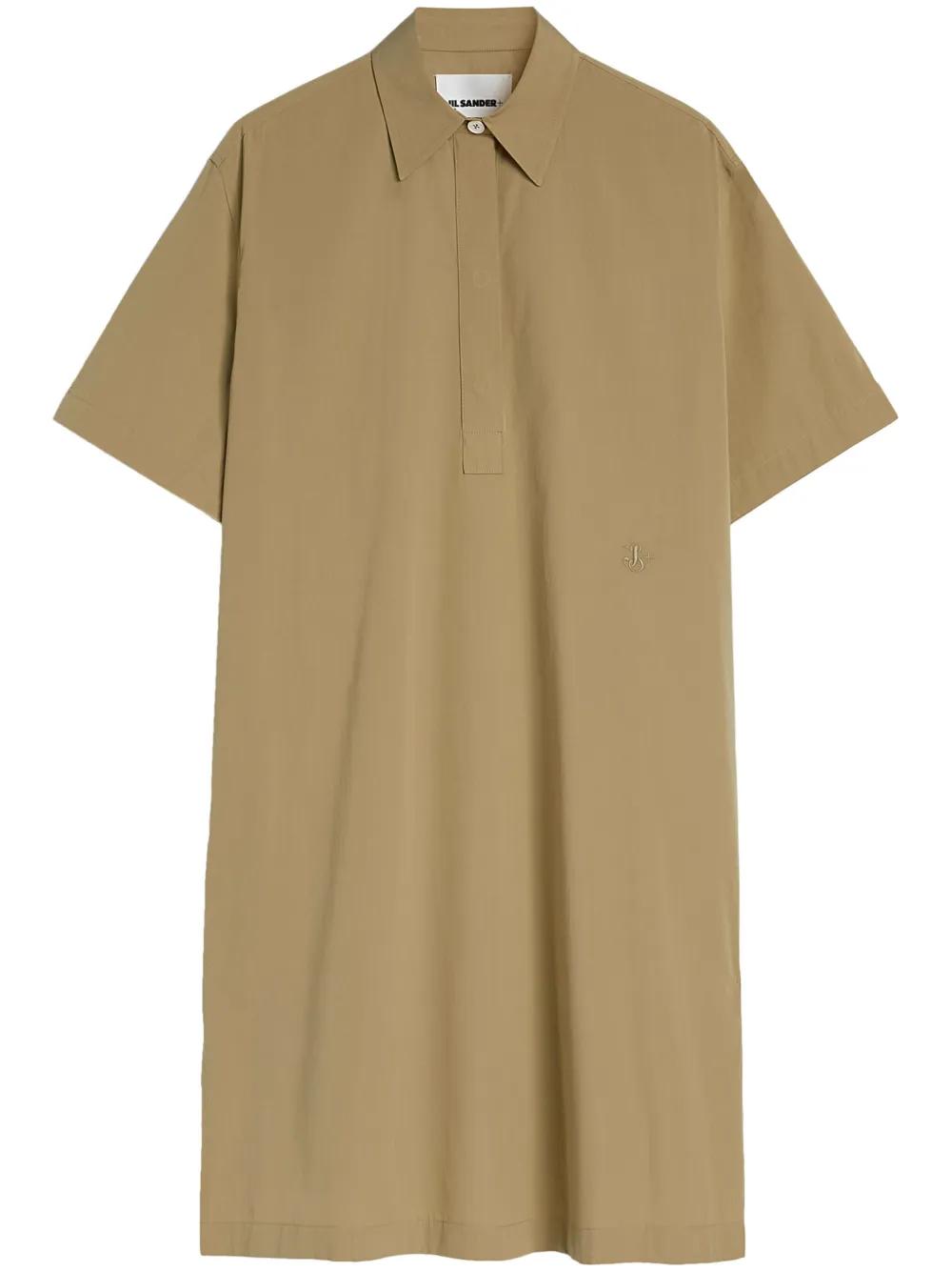 almond beige cotton poplin texture front button placket pointed flat collar drop shoulder short sleeves shift style straight hem mid-length