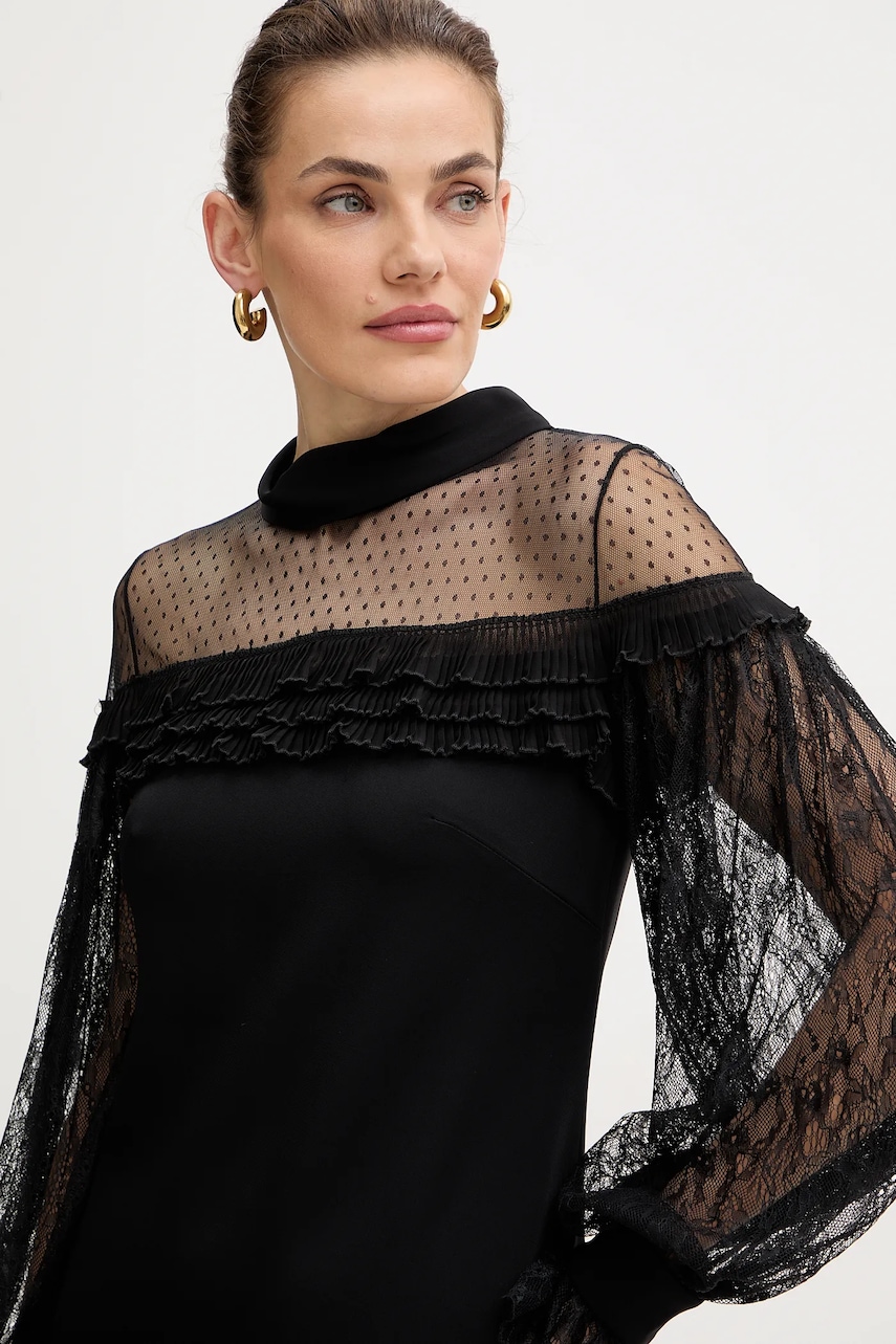 - Model o długości mini. - Prosty fason. - Długie rękawy. - Okrągły dekolt. - Z tyłu zapięcie na kryty suwak, haftki i guziki. - Model z koronkowymi wstawkami. - Model z ozdobnymi falbanami. - Dodatkowa warstwa materiału w postaci podszewki. - Długość: 94 cm. - Długość rękawa: 69 cm. - Szerokość pod pachami: 46 cm. - Wymiary podane dla rozmiaru: 40.