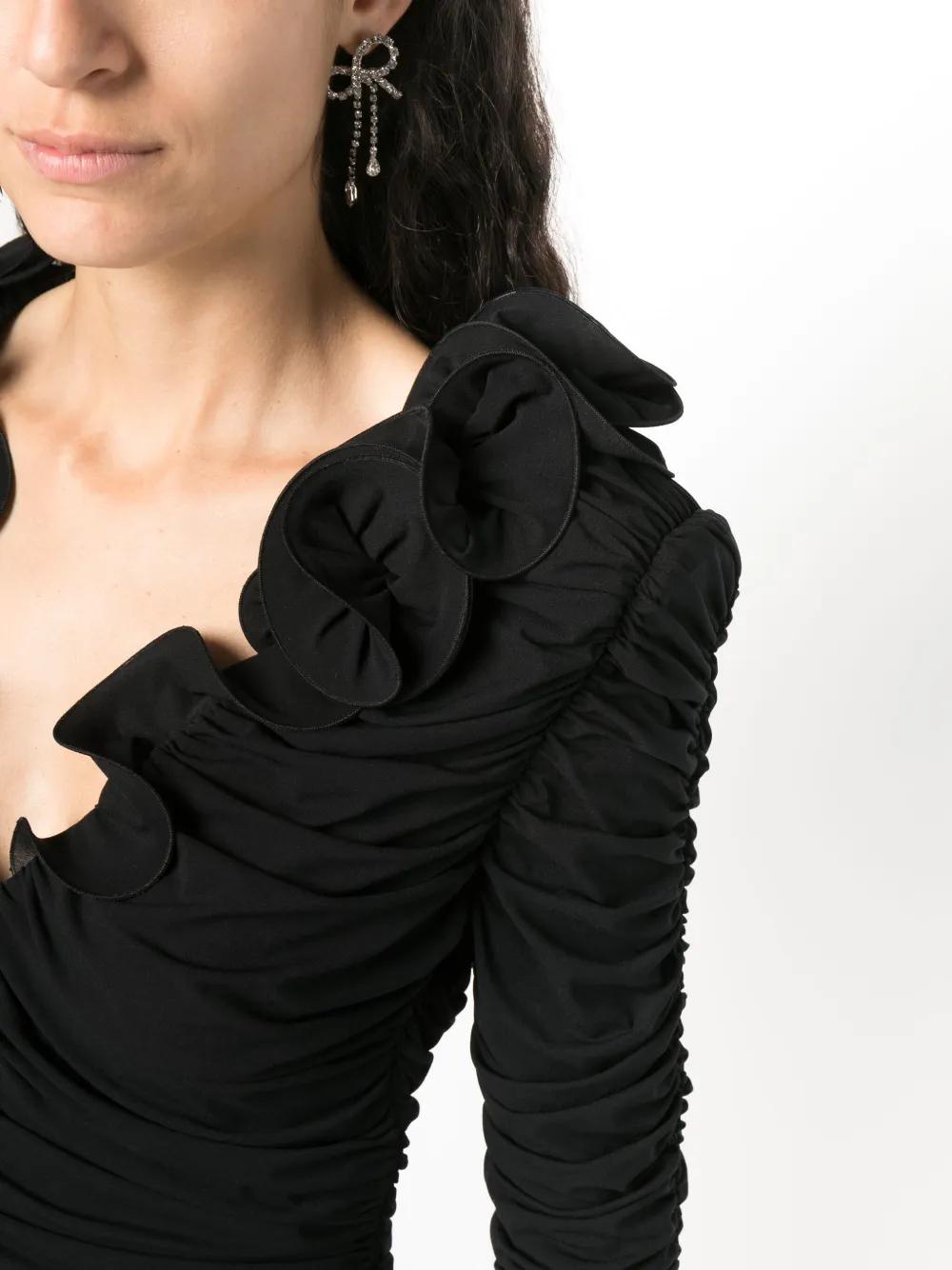 black silk blend ruched detailing floral appliqué V-neck long sleeves concealed rear zip fastening straight hem