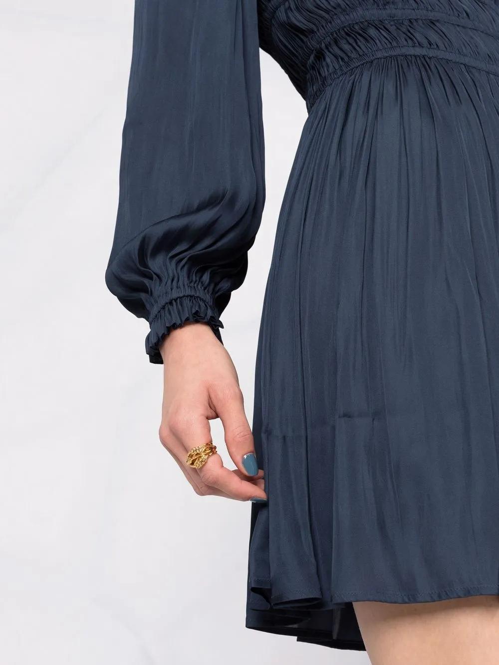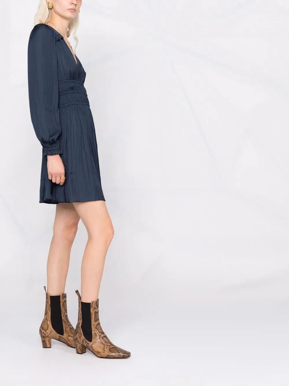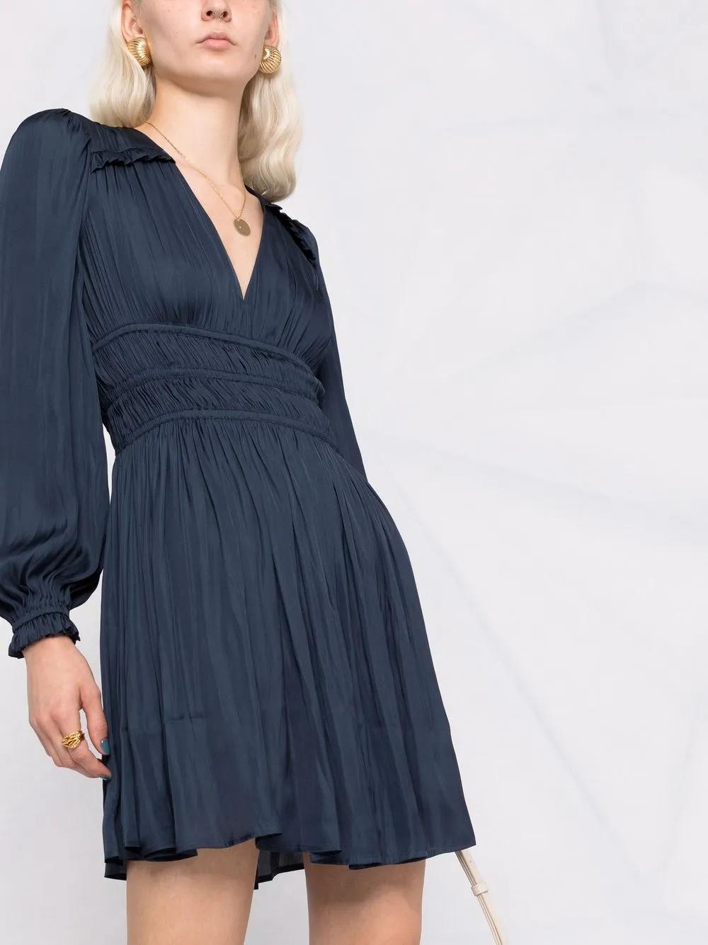 navy-blue fully pleated smocked waist V-neck bishop sleeves curved hem thigh-length