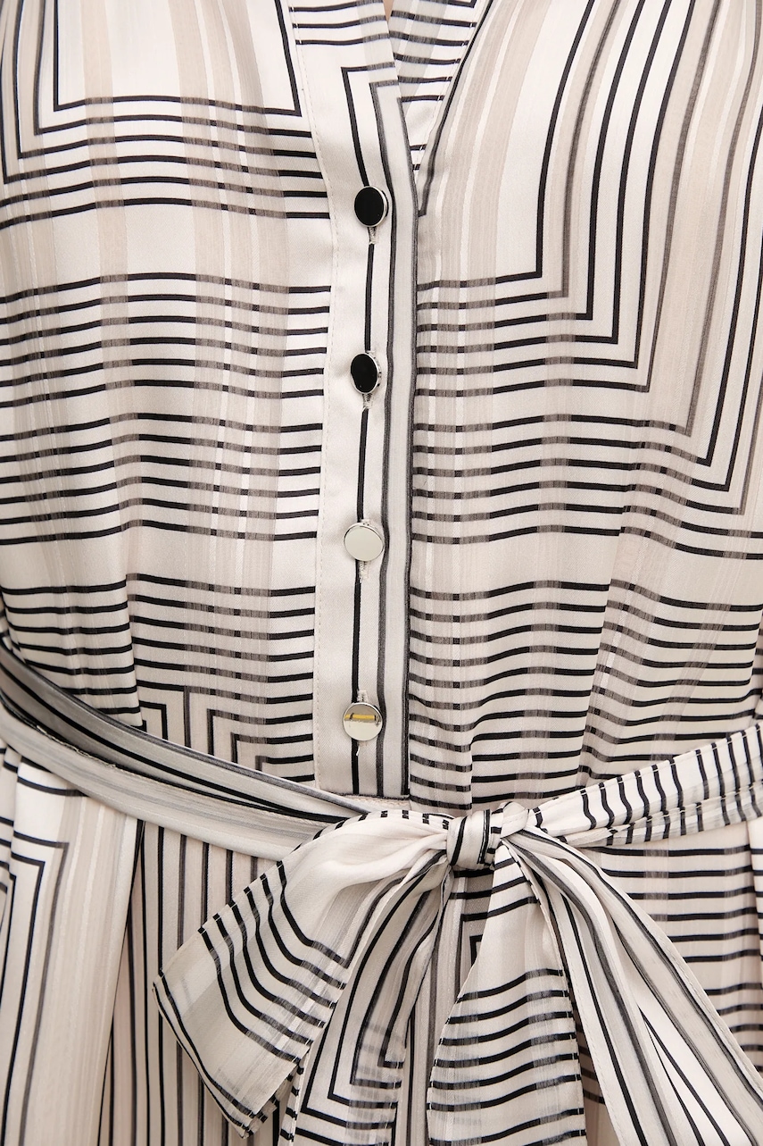- Rozkloszowany fason. - Dodatkowa warstwa materiału w postaci podszewki. - Dołączony tekstylny pasek. - Krótkie zapięcie na guziki. - Spiczasty dekolt z kołnierzykiem.