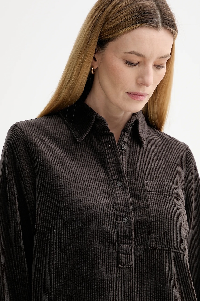 - (OCS) ORGANIC CONTENT STANDARD. Produkty z tym certyfikatem zawierają co najmniej 50% organicznych włókien naturalnych - bez syntetycznych pestycydów i nawozów chemicznych. Łańcuch dostaw tych wyrobów tekstylnych jest kontrolowany w celu zagwarantowania, że produkt zawiera materiał pozyskany w sposób ekologiczny. - Prosty, nie blokujący ruchów fason. - Rękawy z zapinanymi mankietami. - Model z miękkim kołnierzykiem. - Krótkie zapięcie na guziki ułatwia sprawną wentylację oraz swobodne ubieranie i ściąganie. - Dwie wsuwane kieszenie boczne. - Kieszonka na piersi. - Model bez podszewki. - Długość rękawa: 62 cm. - Długość: 93 cm. - Szerokość pod pachami: 55 cm. - Wymiary podane dla rozmiaru: S.