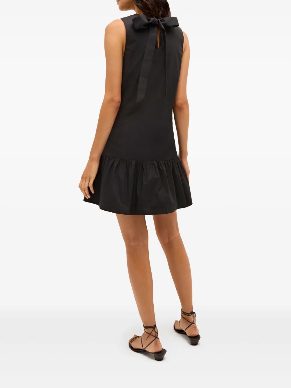 black sleeveless round neckline tie detail at back fitted bodice flared ruffle hem