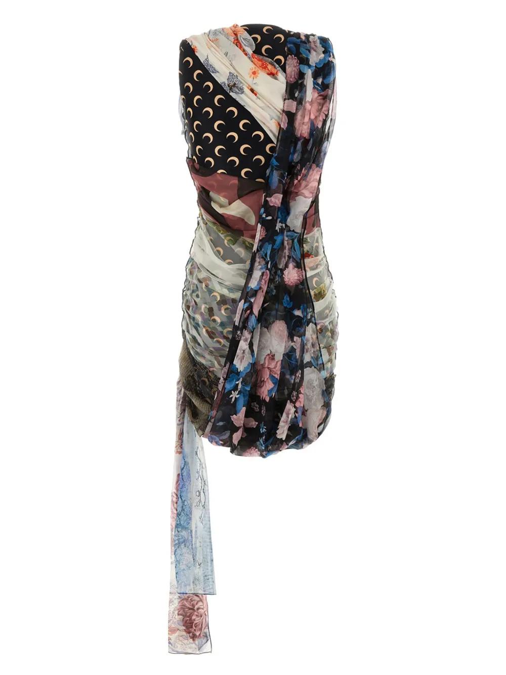 multicolour silk crew neck sleeveless draped design patchwork design layered design crescent moon print gathered detailing