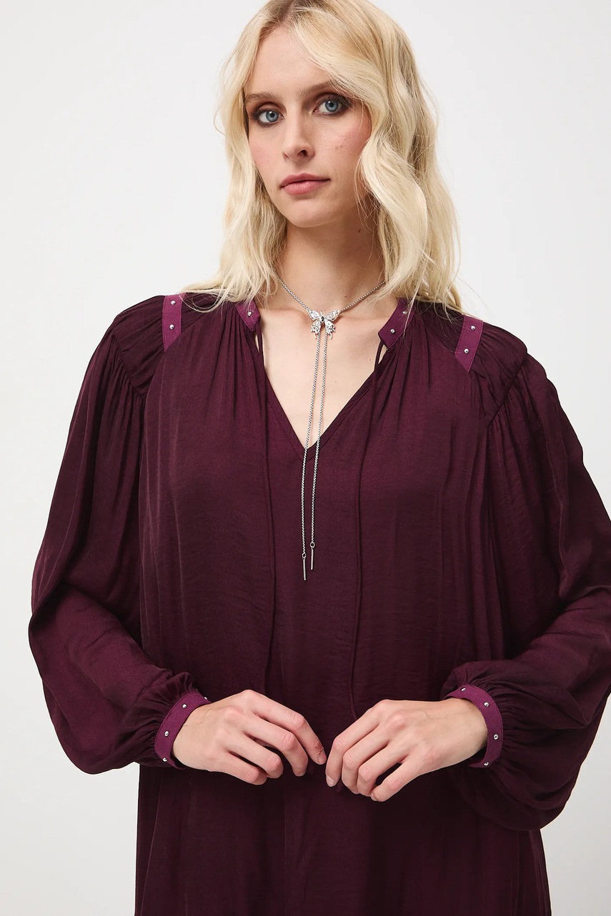 - Luźny fason. - Długi, raglanowy rękaw. - Mankiety zapinane na guziki. - Ozdobne wykończenia rękawów. - Spiczasty dekolt z wiązaniem. - Model z ozdobną falbaną. - Ozdobne marszczenia. - Ozdobne detale. - Model na podszewce. - Gładka tkanina. - Model o długości mini. - Długość rękawa(mierzona od dekoltu): 74 cm. - Szerokość w biuście: 55 cm. - Długość: 91 cm. - Wymiary podane dla rozmiaru: S.