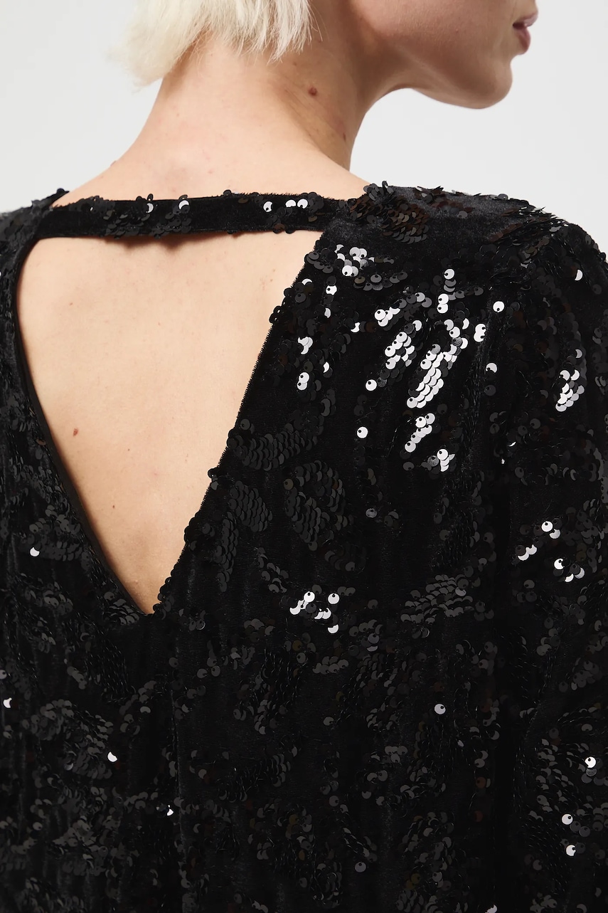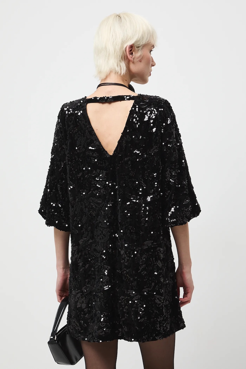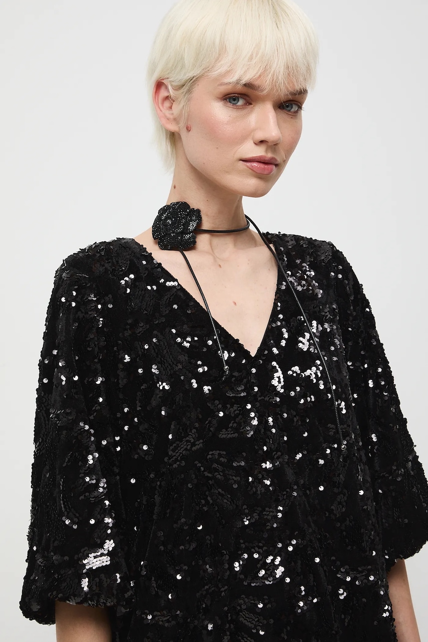 - Luźny fason. - Rękaw trzy czwarte. - Spiczasty dekolt. - Ozdobne wycięcie z tyłu. - Model na podszewce. - Model z materiału z cekinami. - Model o długości mini. - Szerokość w biuście: 49,5 cm. - Długość: 87 cm. - Wymiary podane dla rozmiaru: S.