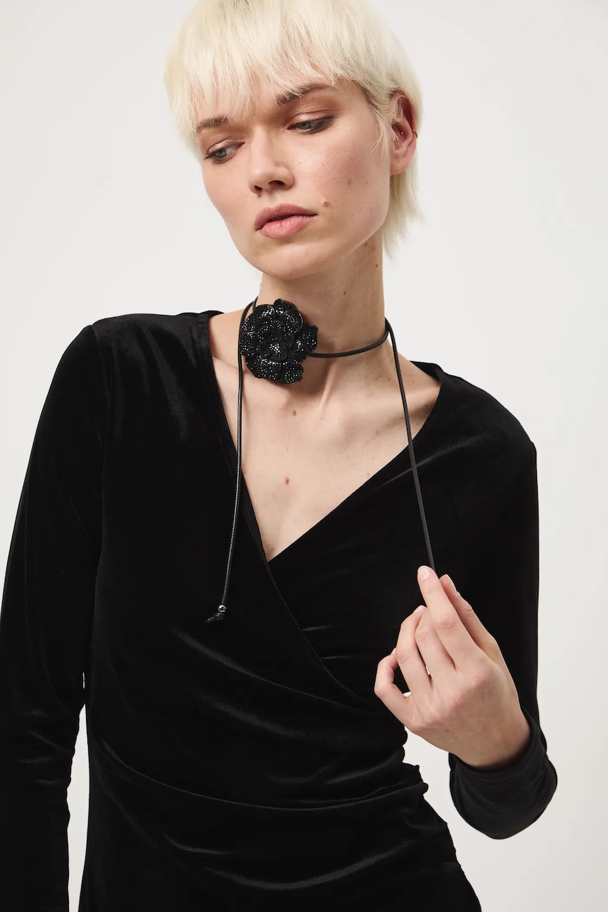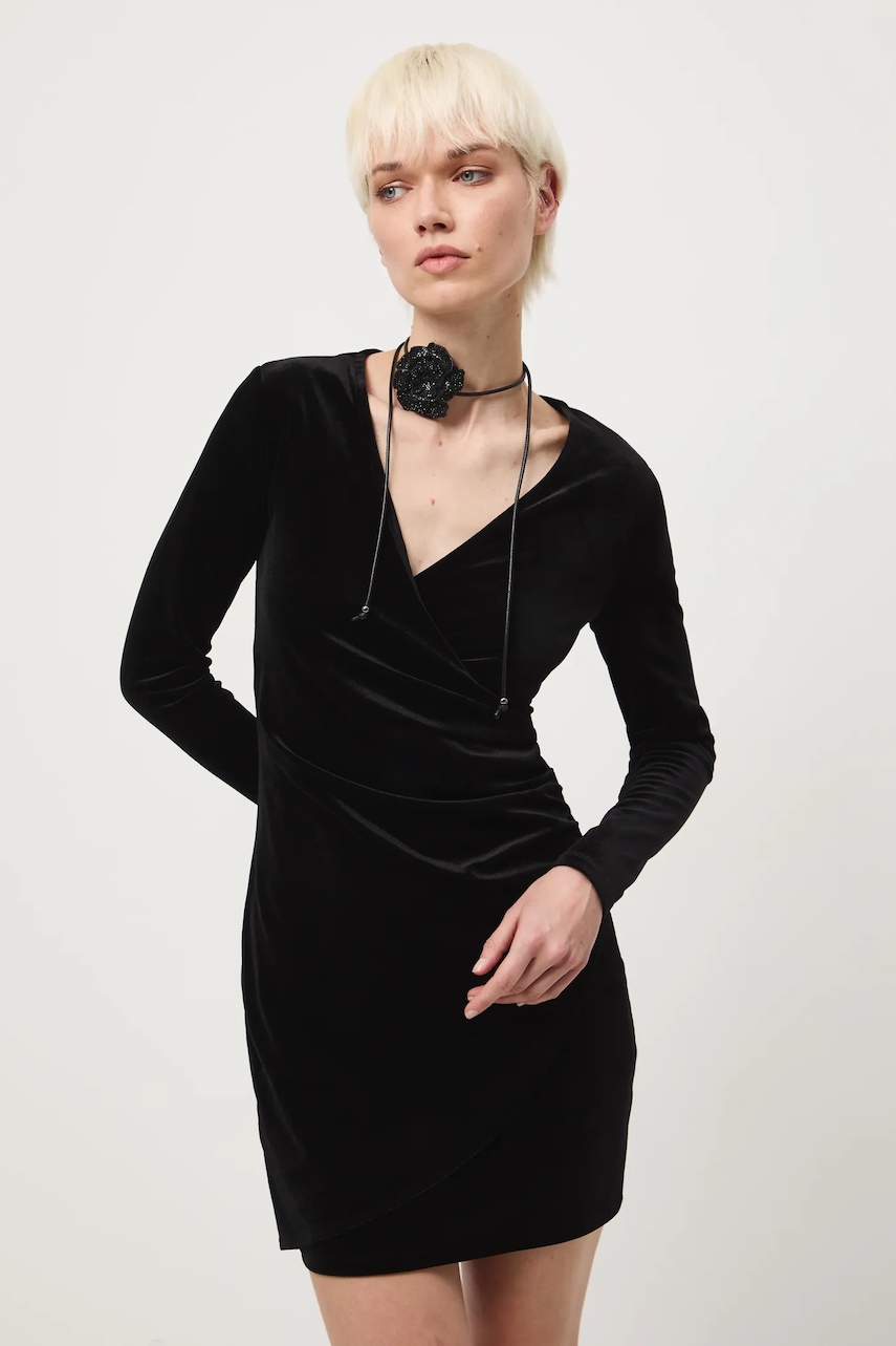 - Dopasowany fason. - Długie rękawy. - Spiczasty, kopertowy dekolt. - Ozdobne marszczenia. - Model wykonany z welurowego materiału. - Model o długości mini. - Długość rękawa: 60 cm. - Szerokość w talii: 34 cm. - Szerokość w biuście: 39 cm. - Długość: 87,5 cm. - Wymiary podane dla rozmiaru: S.