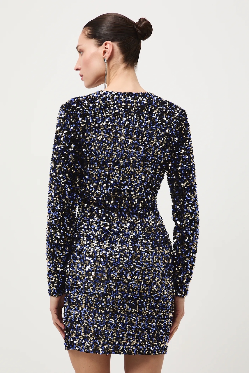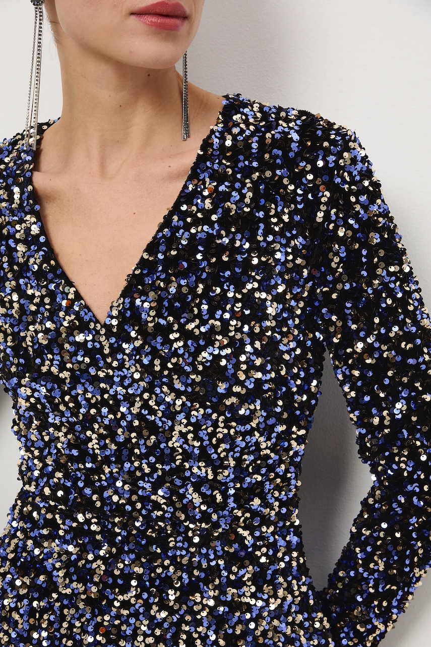 - Dopasowany fason. - Długie rękawy. - Spiczasty dekolt. - Model z materiału z cekinami. - Model na podszewce. - Model o długości mini. - Szerokość w talii: 34 cm. - Szerokość w biuście: 41 cm. - Długość rękawa: 61 cm. - Długość: 88 cm. - Wymiary podane dla rozmiaru: S.