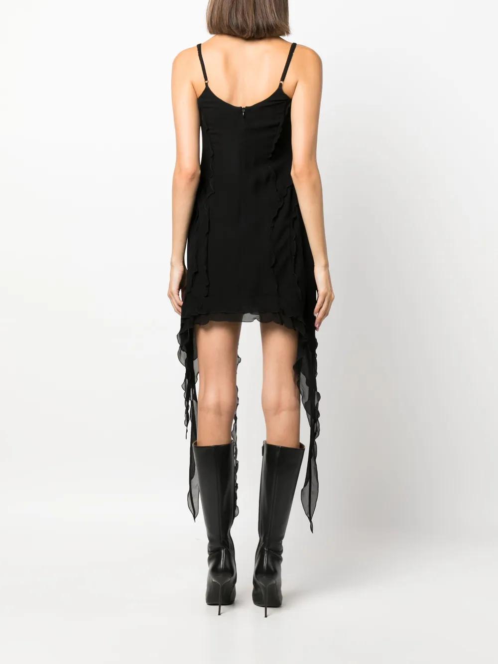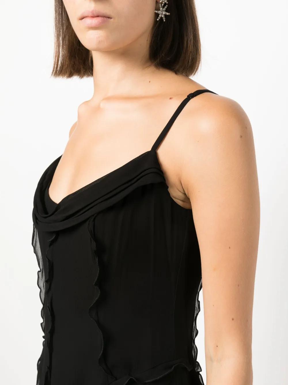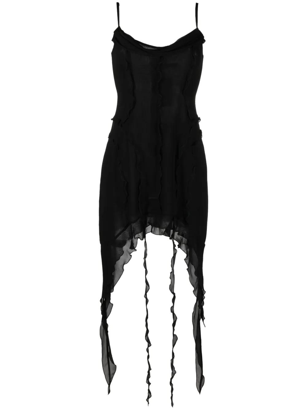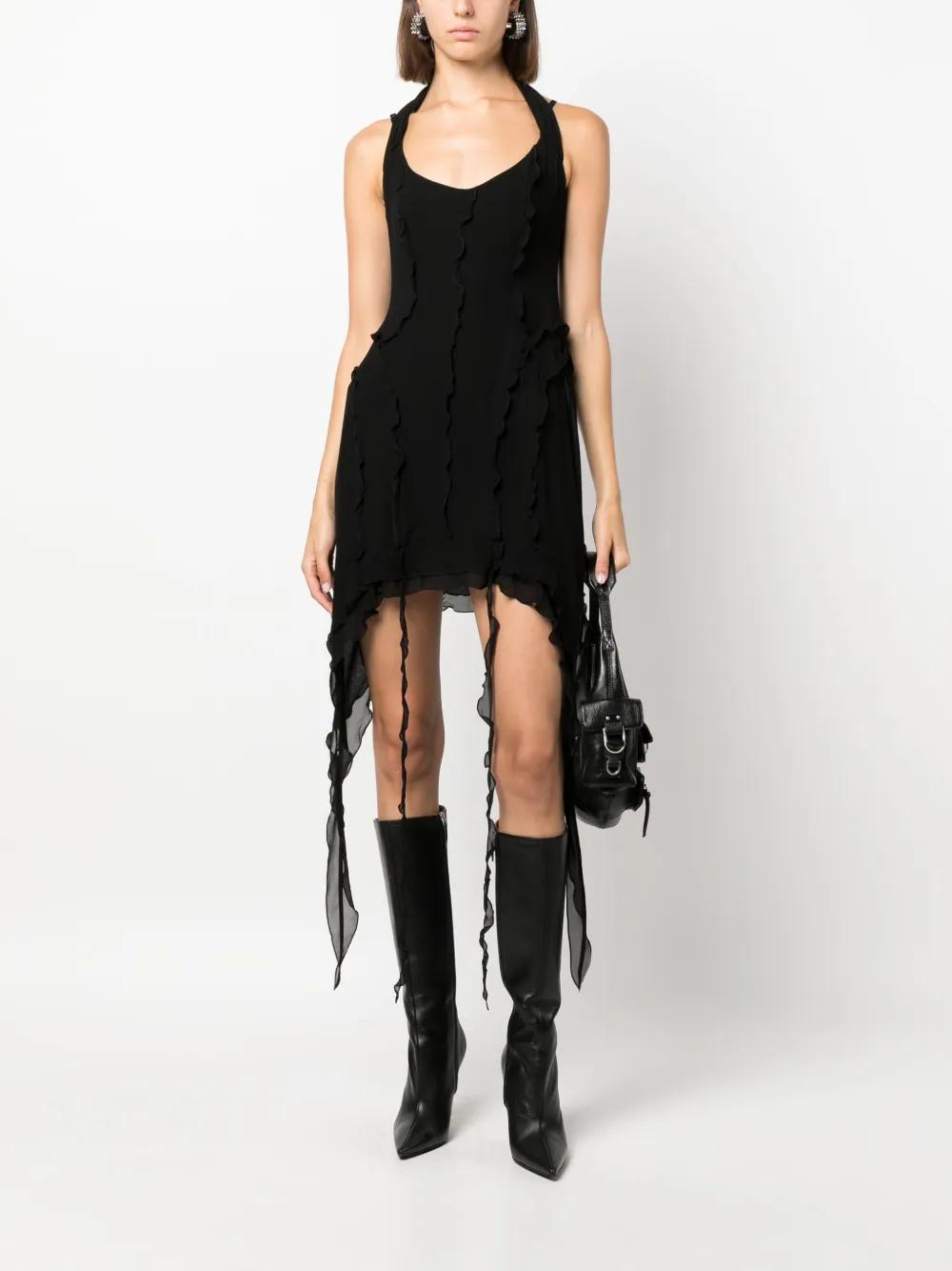 black recycled viscose ruffled detailing seam detailing cowl neck halterneck tie fastening adjustable spaghetti straps rear zip fastening bodycon design handkerchief hem thigh-length