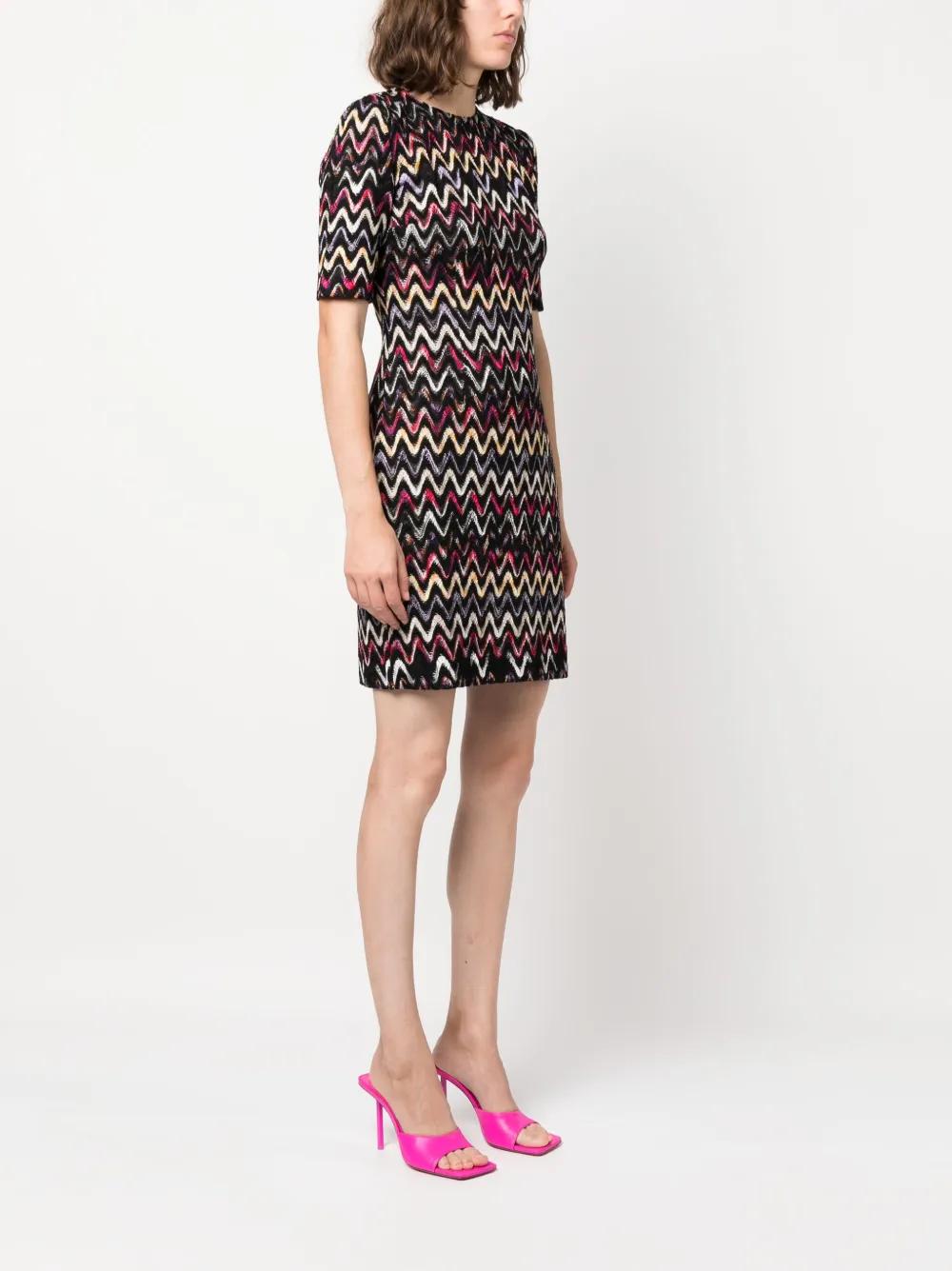 black/multicolour wool blend zigzag embroidery round neck rear zip fastening short sleeves slim cut above-knee length straight hem The item you receive may differ slightly from the item photographed. This is due to the artisanal nature with which all Missoni products are constructed.