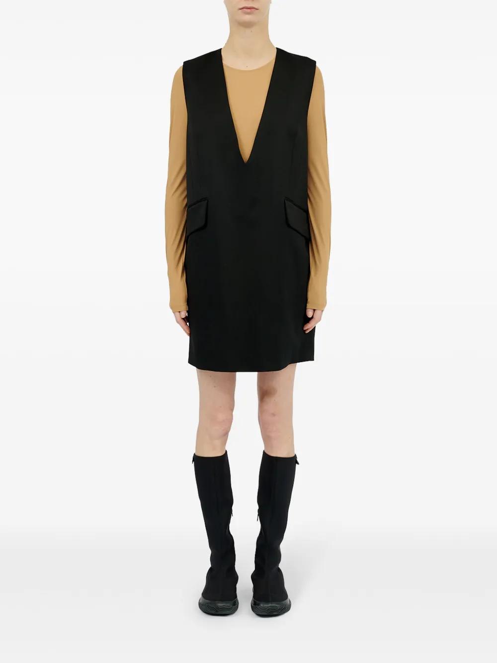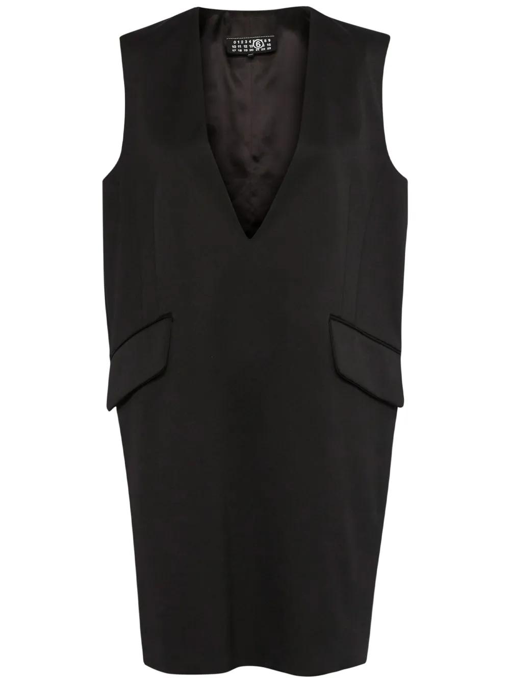 black twill weave dart detailing plunging V-neck sleeveless two side flap pockets thigh-length straight hem