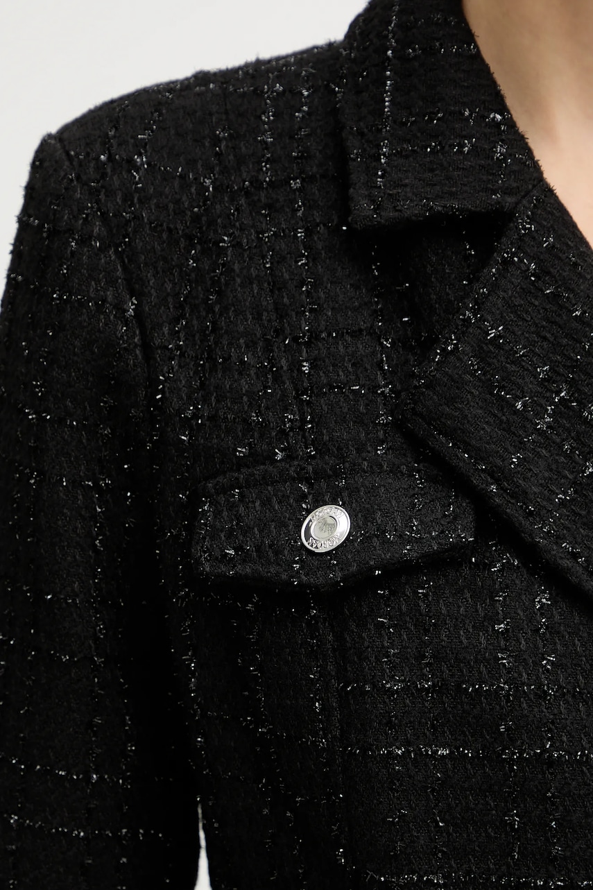 - Dopasowany, podkreślający sylwetkę fason. - Wygodne zapięcie na suwak ułatwia zakładanie i zdejmowanie. - Model z miękkim kołnierzykiem. - Klasyczne klapy. - Imitacja kieszeni z przodu. - W ramiona wszyte poduszki. - Materiał z metaliczną nicią. - Dodatkowa warstwa materiału w postaci podszewki. - Długość rękawa: 46 cm. - Długość: 86 cm. - Szerokość pod pachami: 45 cm. - Szerokość w talii: 37,5 cm. - Szerokość w biodrach: 50 cm. - Wymiary podane dla rozmiaru: 36.