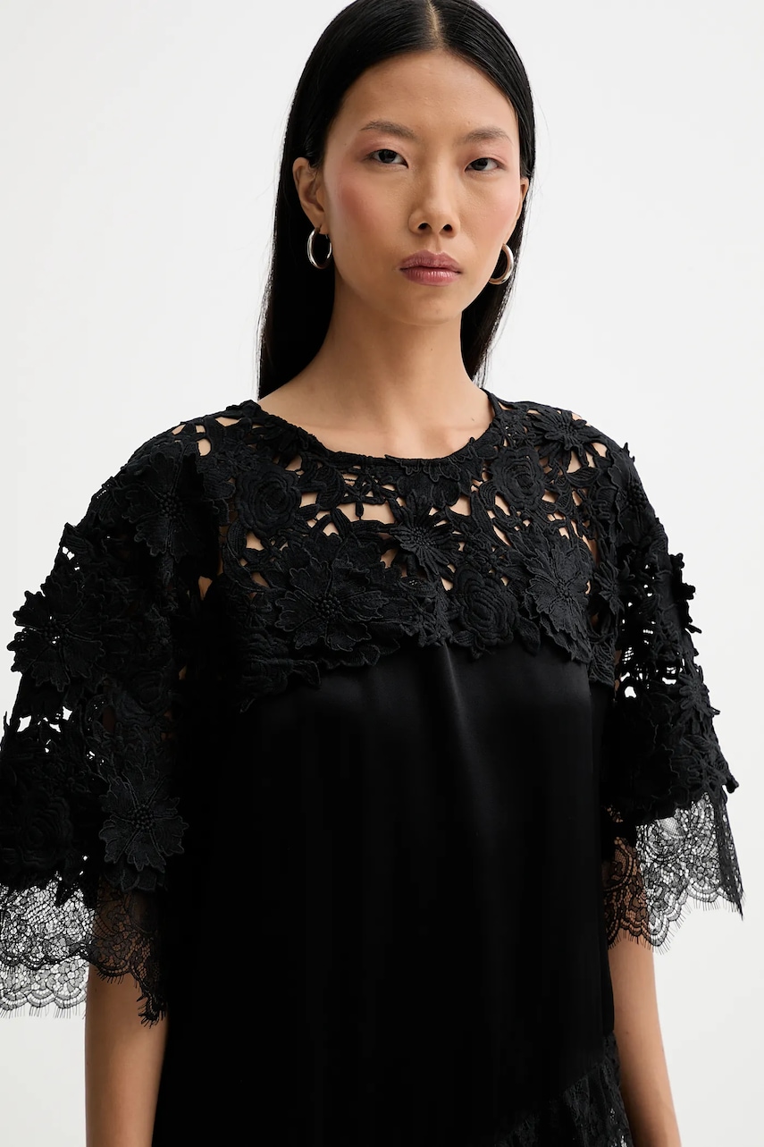 - Luźny fason. - Okrągły dekolt. - Gładka tkanina. - Koronkowe wstawki. - Krótki rękaw. - Z tyłu zapięcie na guzik. - Długość: 100 cm. - Szerokość pod pachami: 49 cm. - Wymiary podane dla rozmiaru: 36.