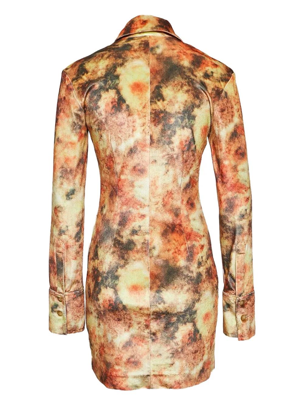 orange hazy floral print velvet finish pointed collar front button closure long sleeves Condition: UNWORN. This item is previously owned but remains unworn and in its original condition. However, it does not come with its original tags.