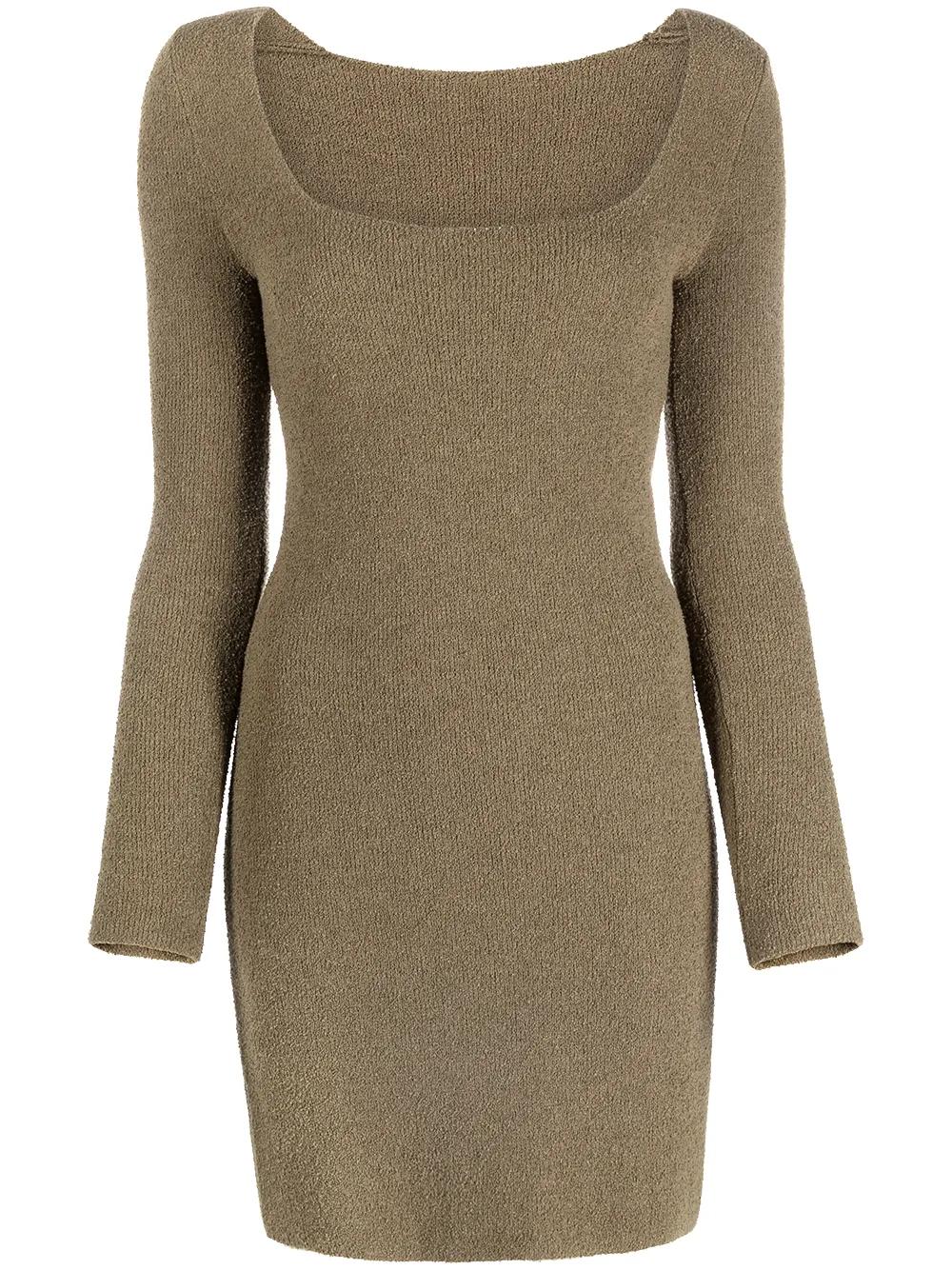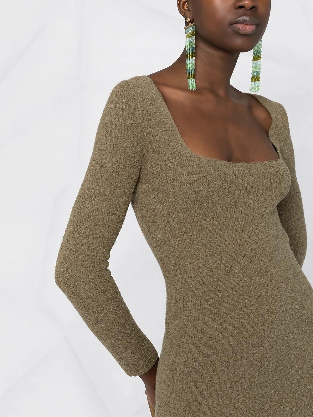 dusty green knitted construction slim cut square neck long sleeves straight hem thigh-length