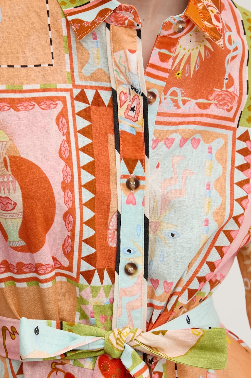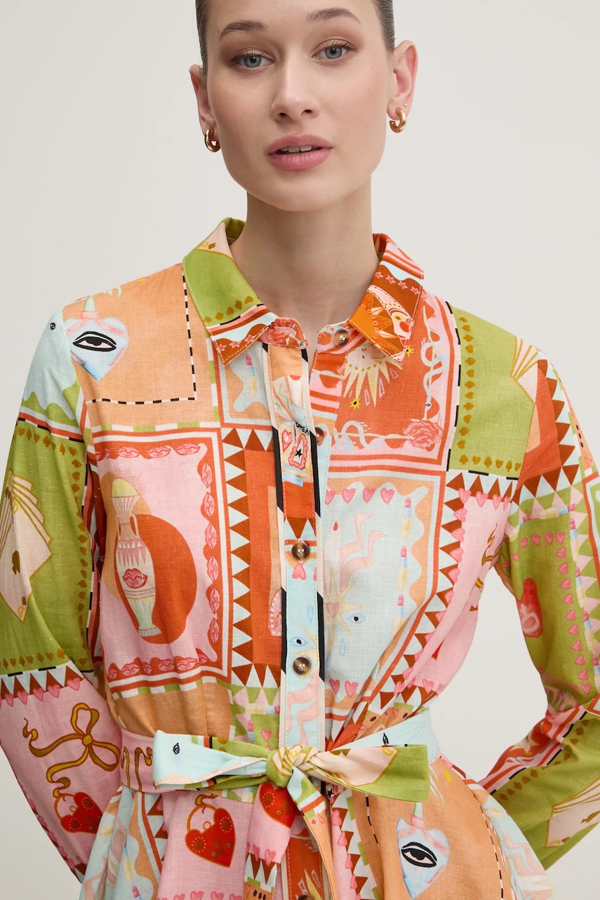 - Rozkloszowany fason. - Długi rękaw. - Rękawy z zapinanymi mankietami. - Model z kołnierzykiem. - Wygodne zapięcie na guziki ułatwia zakładanie i zdejmowanie. - Model bez podszewki. - Dołączony tekstylny pasek. - Cienka, nieelastyczna tkanina. - Długość rękawa: 61 cm. - Długość: 89 cm. - Szerokość pod pachami: 44 cm. - Szerokość w talii: 36 cm. - Wymiary podane dla rozmiaru: S.