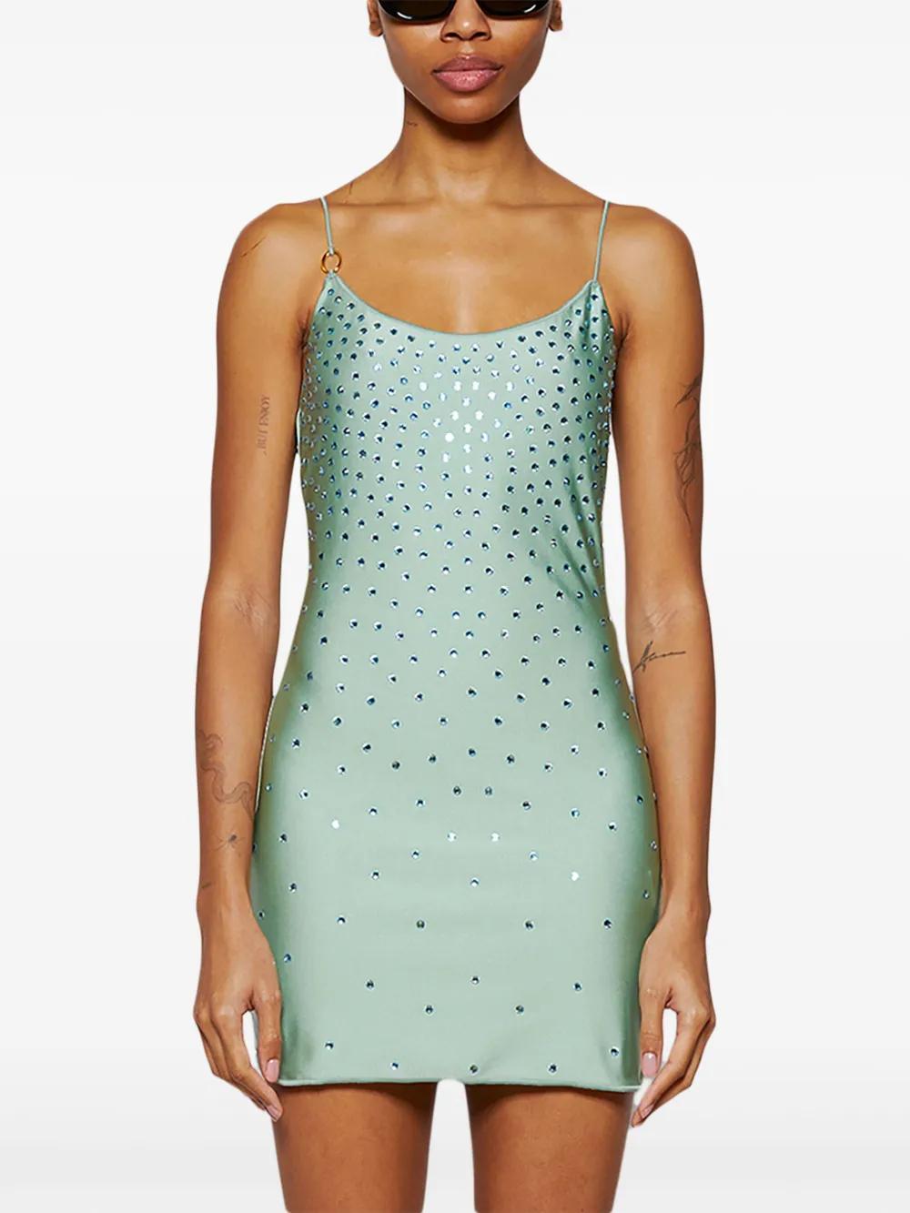 aqua green stretch-design gem embellishment scoop neck spaghetti straps low back thigh-length straight hem