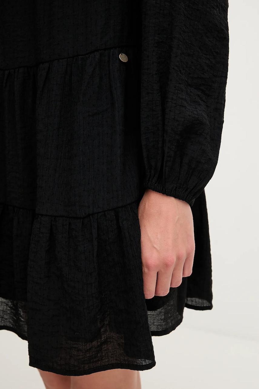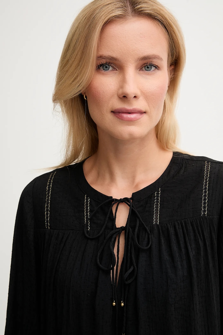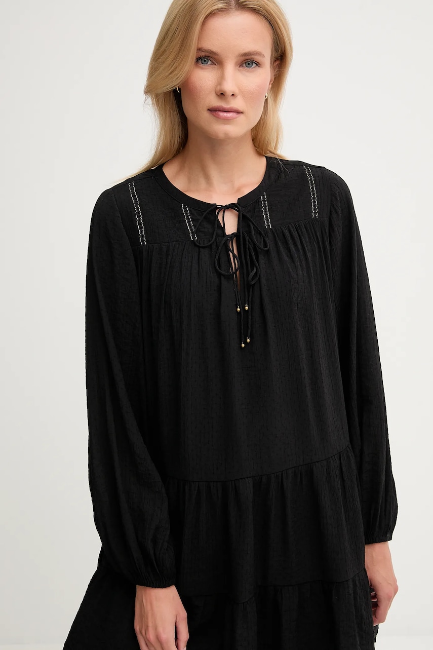 - Model z linii Pepe Future, w skład której wchodzą wyroby powstające w zrównoważonym procesie produkcyjnym. - Rozkloszowany fason. - Ozdobne wiązanie przy dekolcie. - Dodatkowa warstwa materiału w postaci podszewki. - Rękawy wykończone wąskim, elastycznym ściągaczem. - Długość rękawa: 59 cm. - Długość: 86 cm. - Szerokość pod pachami: 45 cm. - Wymiary podane dla rozmiaru: S.