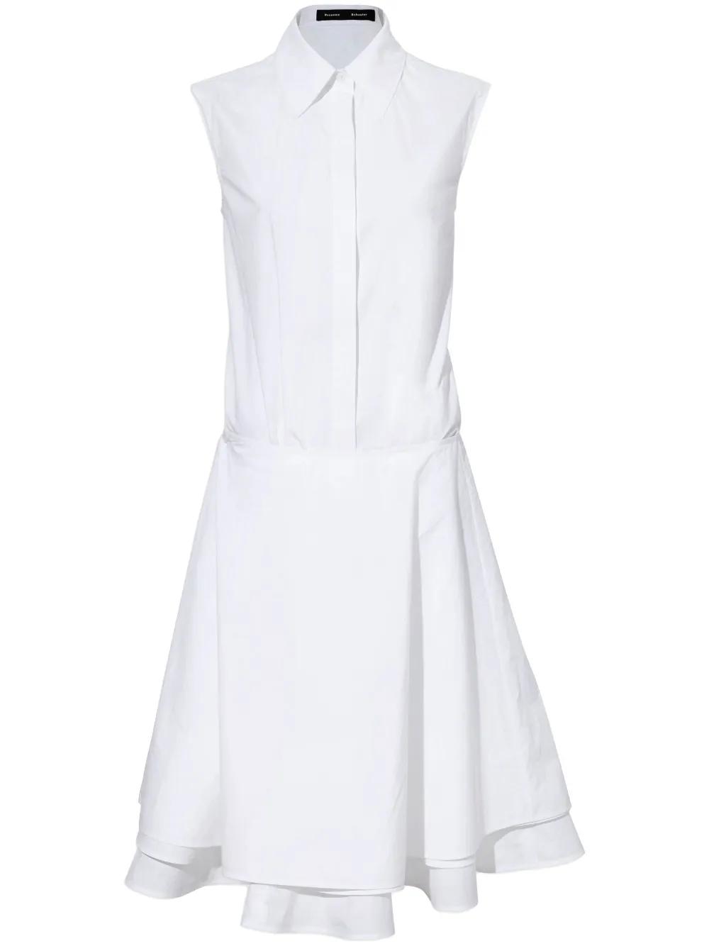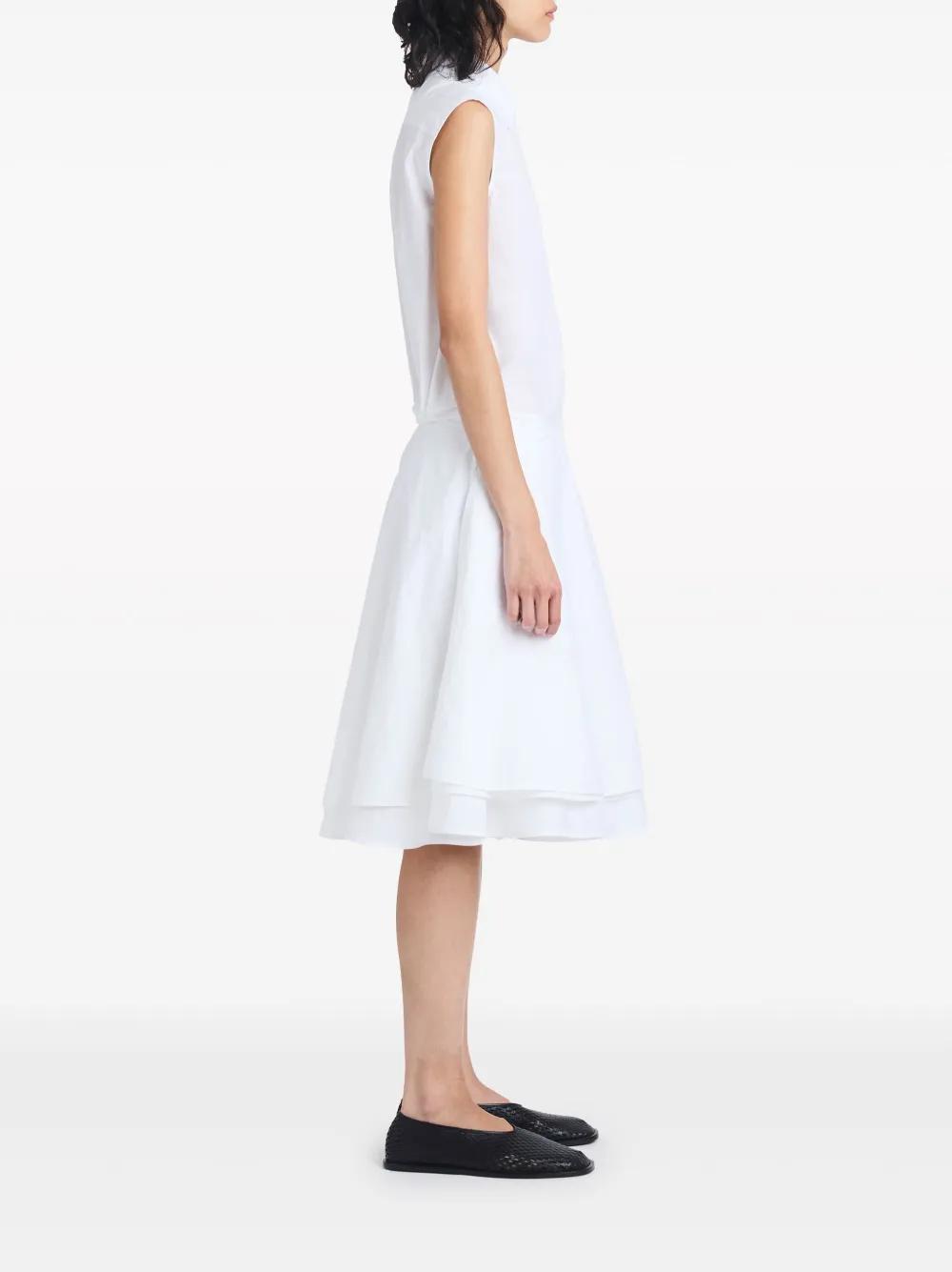 white cotton poplin texture classic collar front button fastening sleeveless flared skirt layered design knee-length straight hem