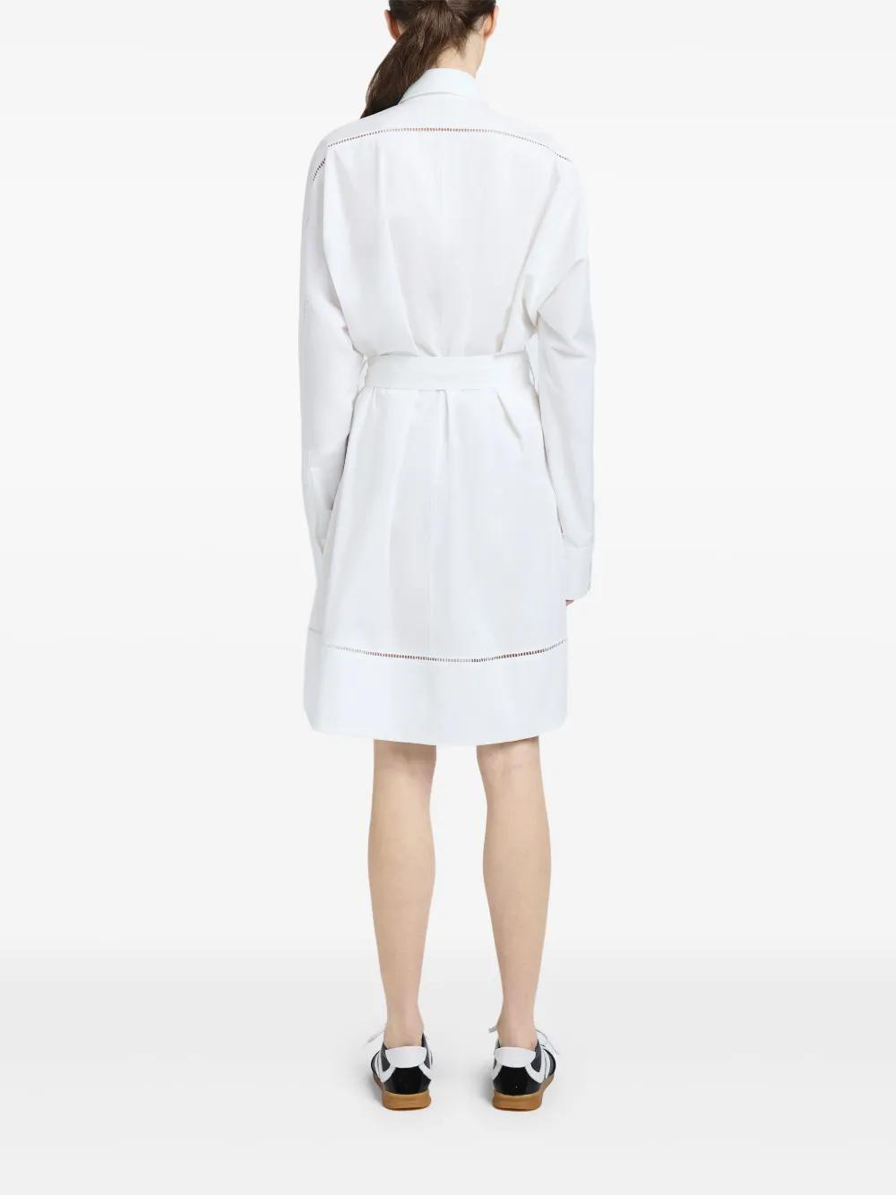 white concealed front button fastening detachable and adjustable waist belt two side inset pockets buttoned cuffs