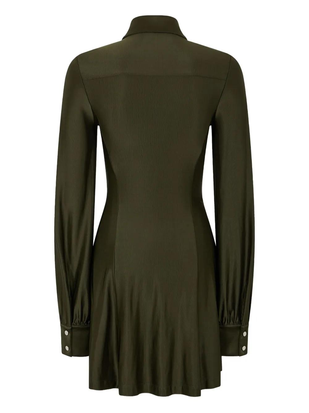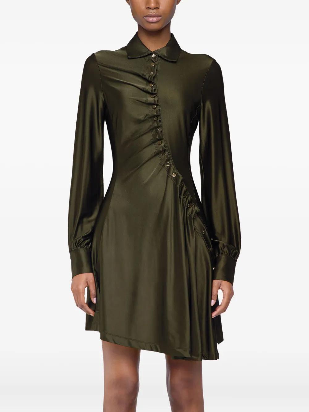 olive green classic collar asymmetrical draping button detailing down the front long sleeves gathered effect