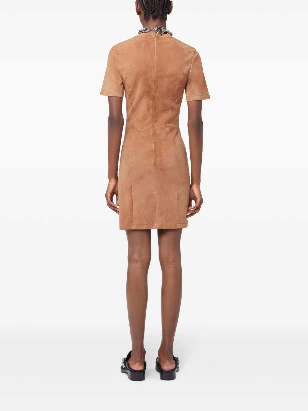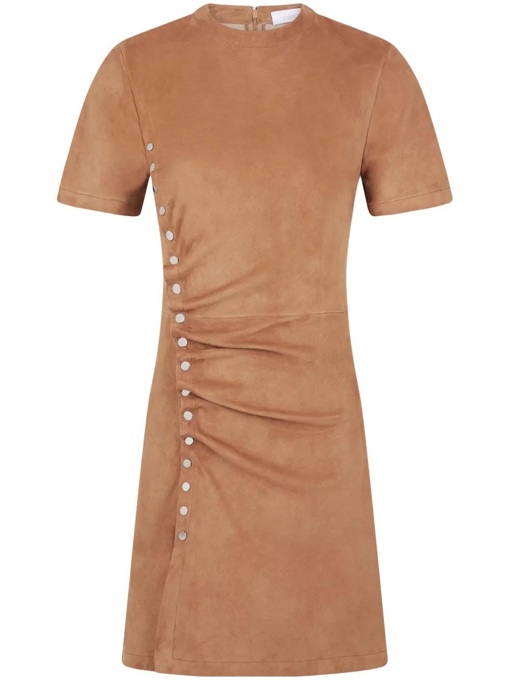 caramel brown press-stud fastening crew neck short sleeves thigh-length