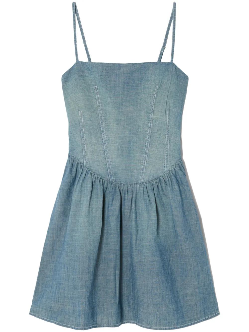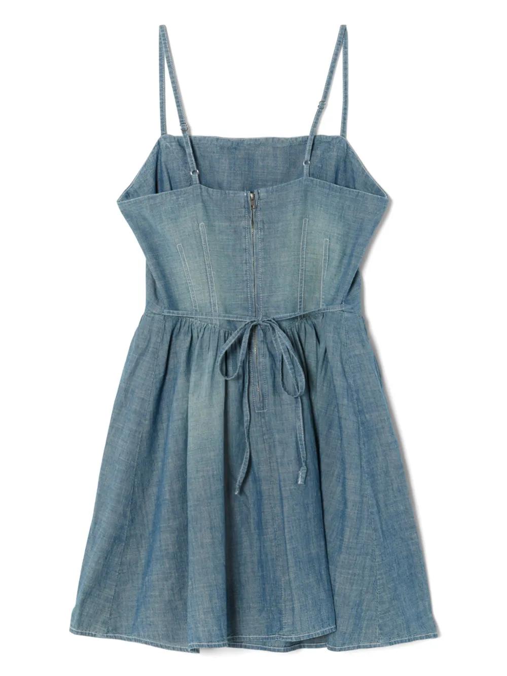 light blue cotton chambray gathered detailing corset style square neck front zip fastening adjustable spaghetti straps flared hem thigh-length