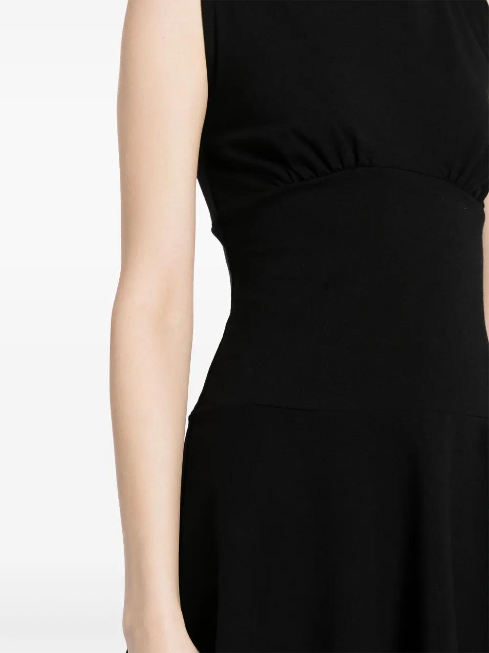black stretch organic cotton ruched detailing boat neck sleeveless flared skirt straight hem thigh-length