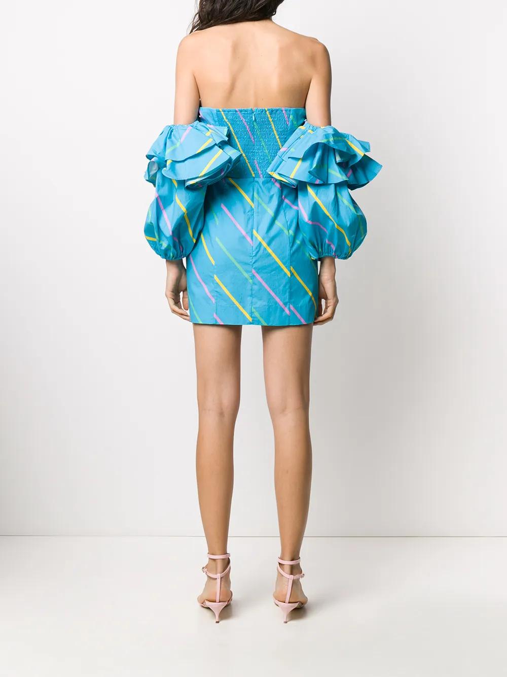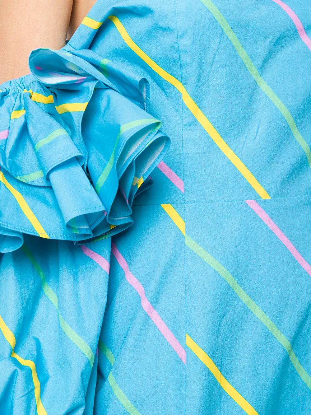 Turquoise blue organic cotton Bethany striped-print dress from ROTATE featuring a striped print, an off the shoulder design, a back zip fastening, ruffled sleeves, a straight hem and a short length. POSITIVELY CONSCIOUS: This product is made organic material, helping reduce chemical use, so you can be confident you are choosing positively.