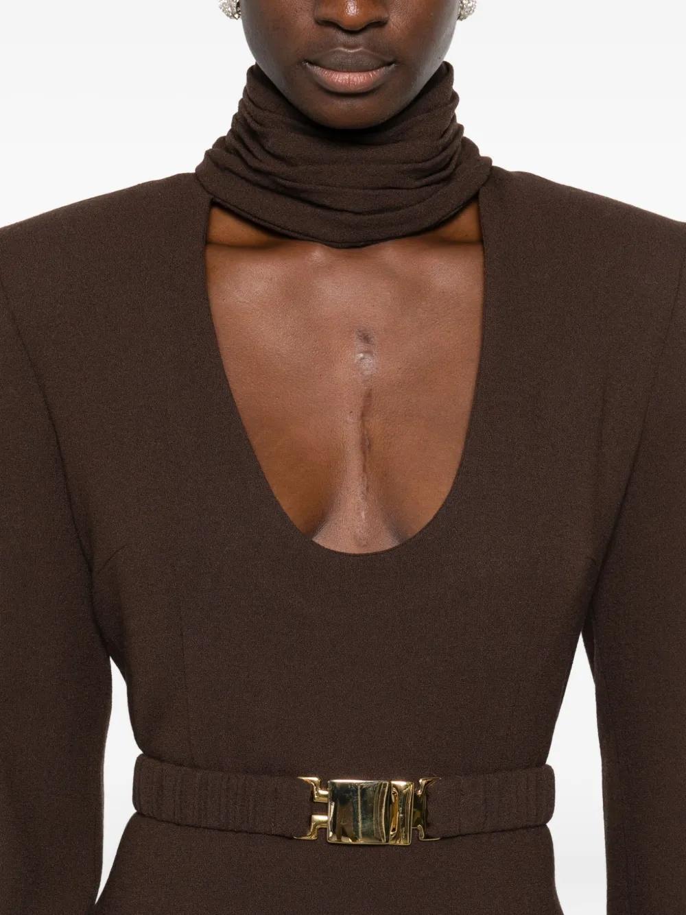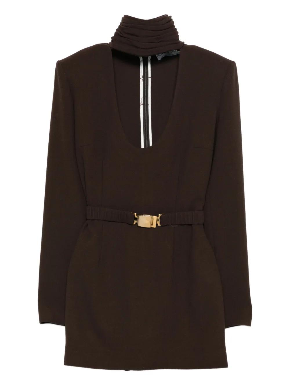 brown cut-out detail long sleeves belted waist thigh length high neck gathered detail