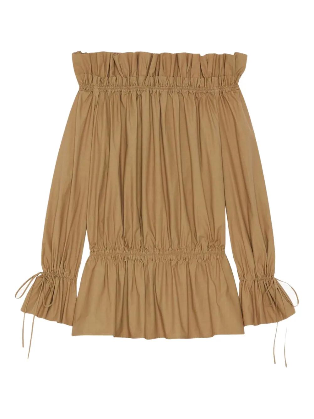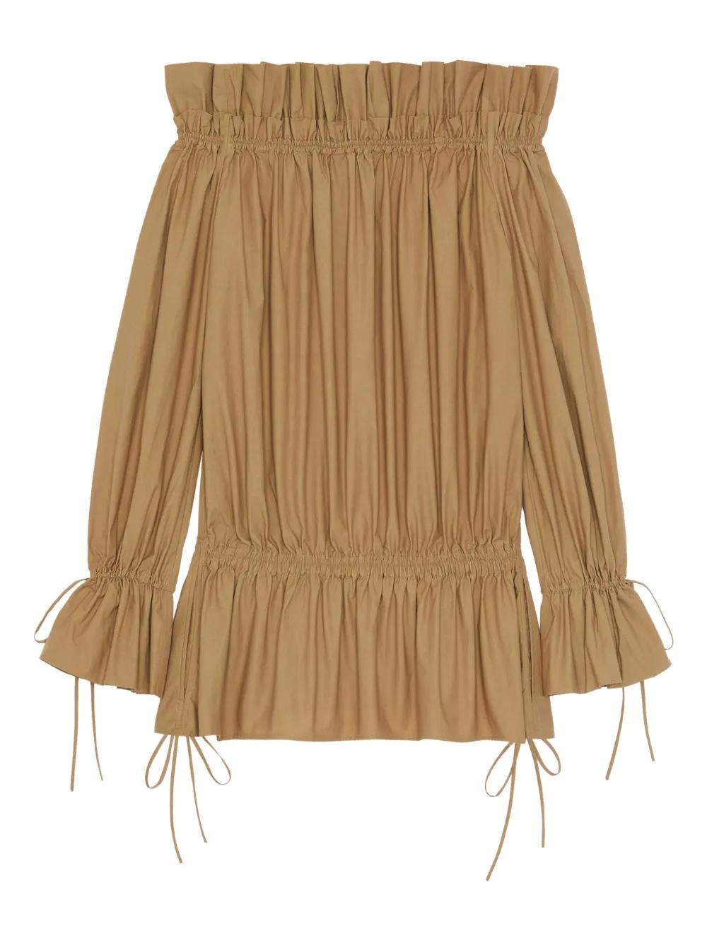 light brown off-shoulder gathered bodice drawstring cuffs flared hem